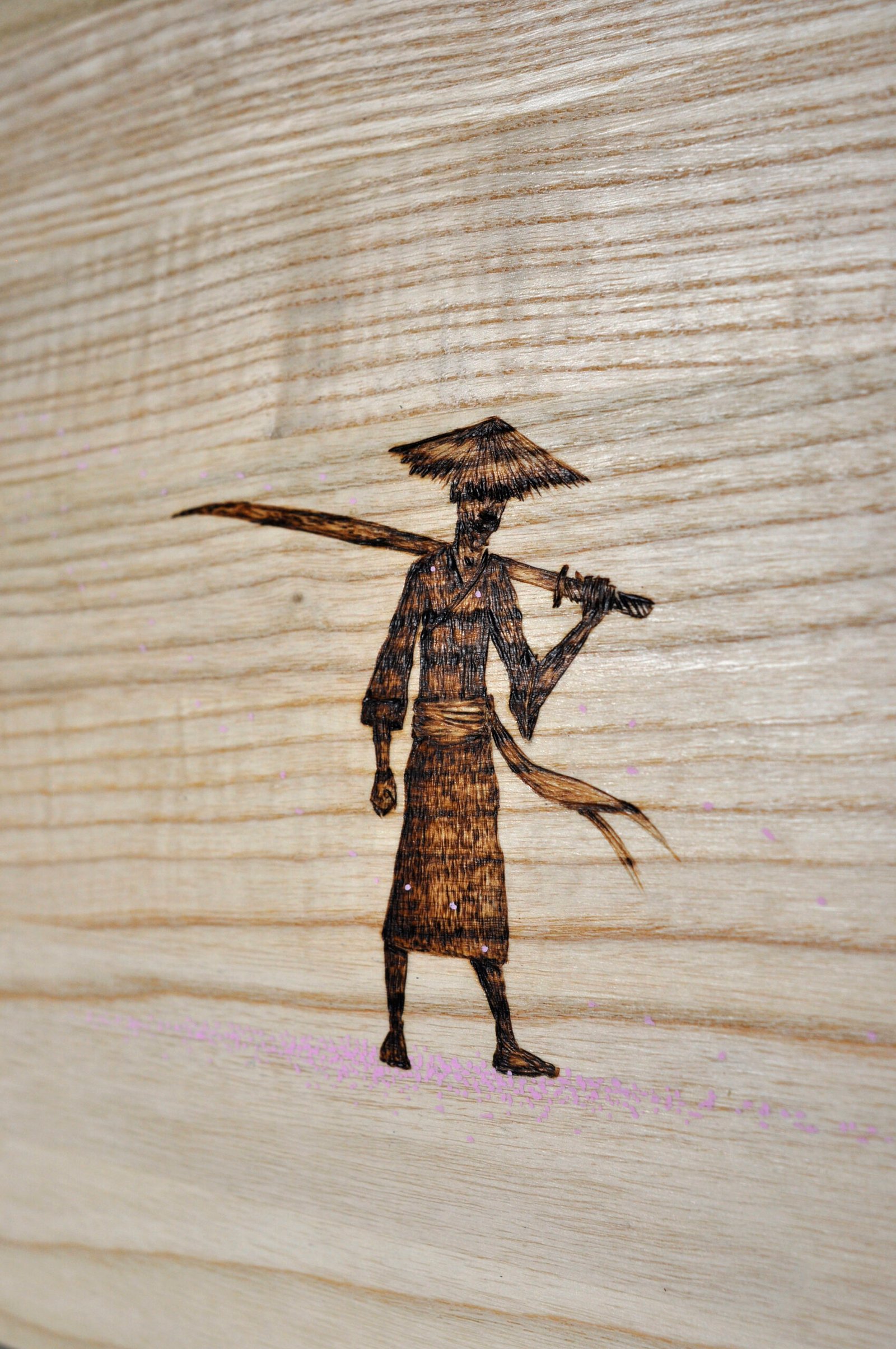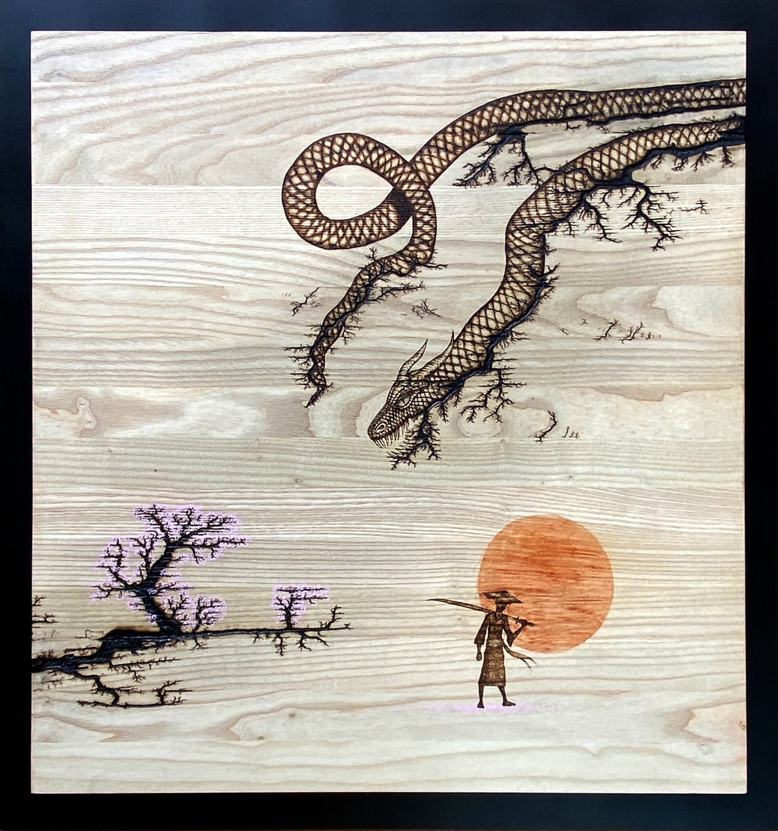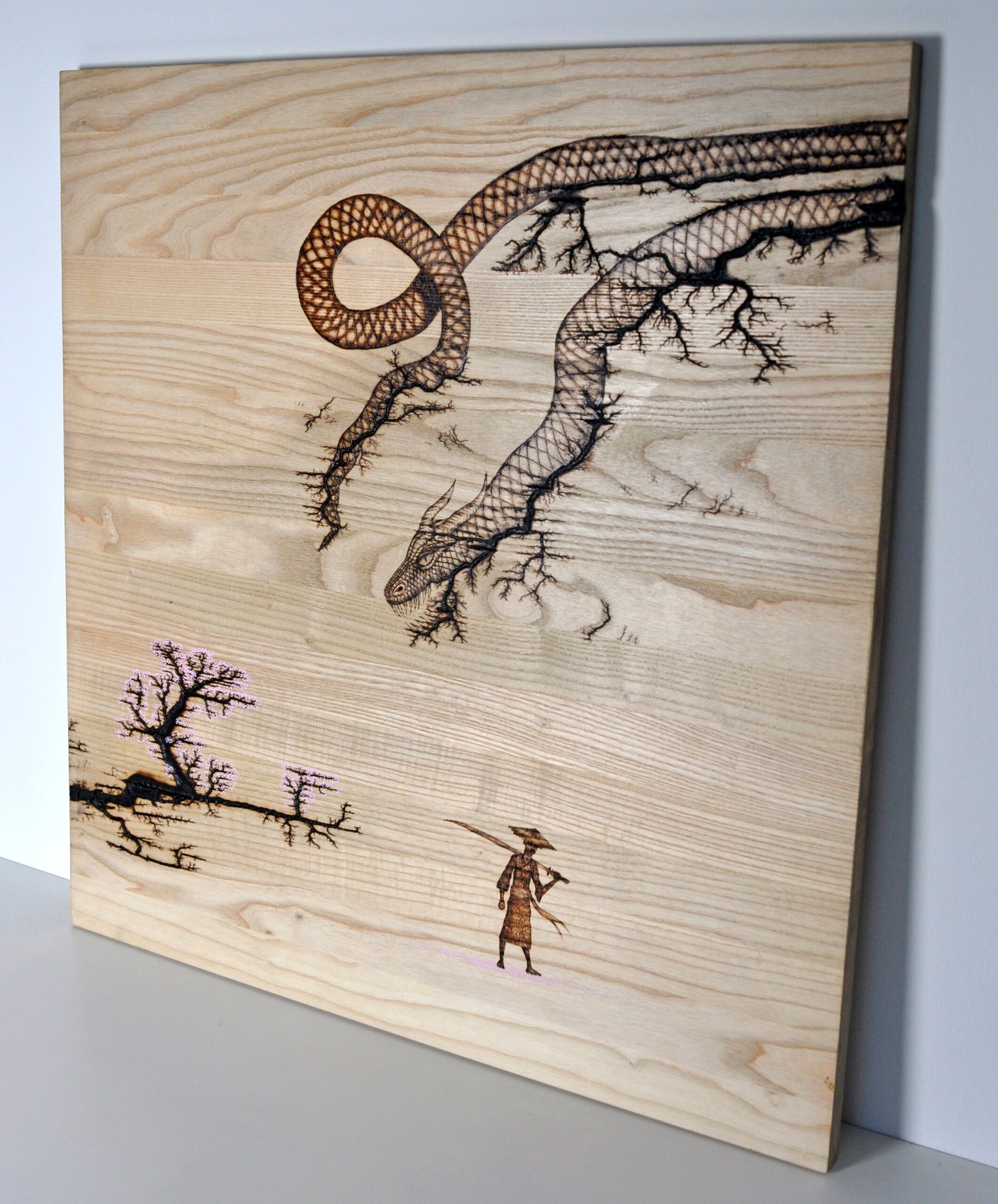 Dragon et Ronin pyrogravés, l'affrontement est imminent mais le Ronin démontre une certaine passivité. Les cerisiers sont en fleurs, les pétales s'envolent et se stockent au pieds du personnage.