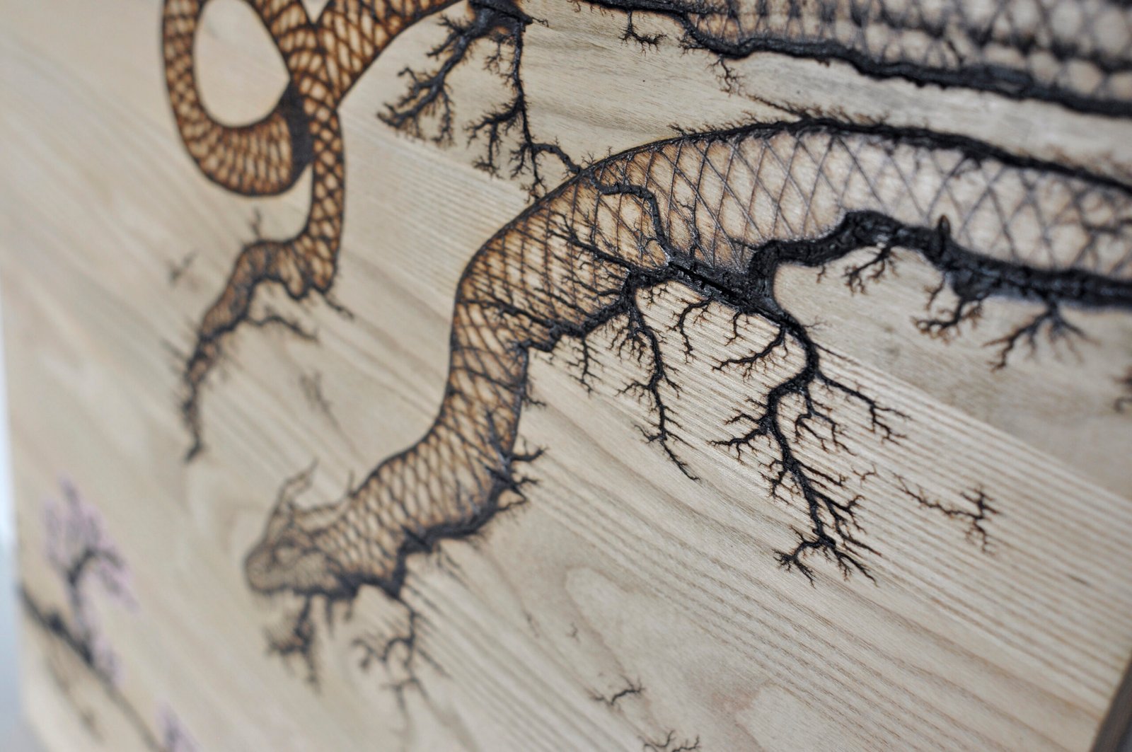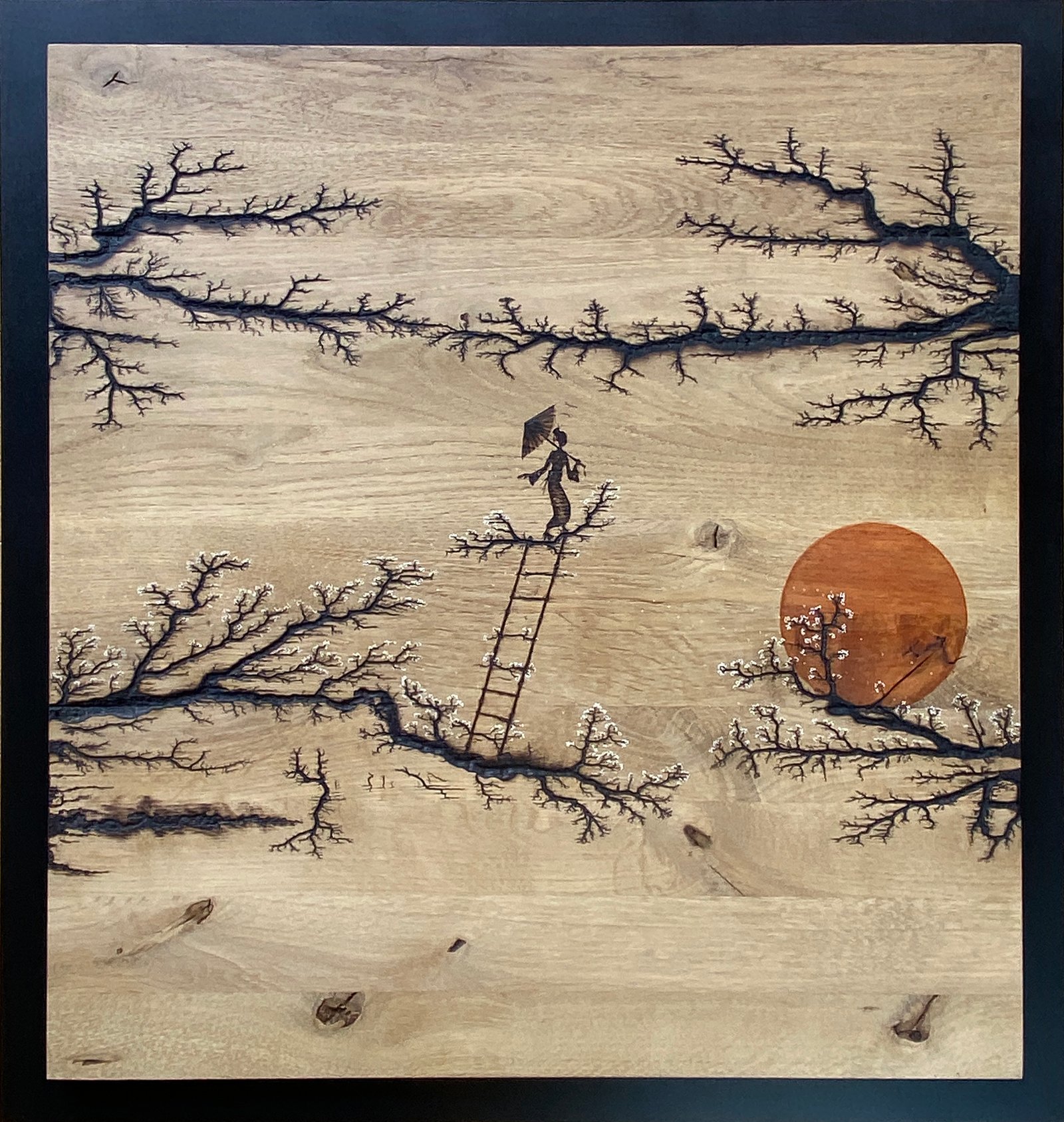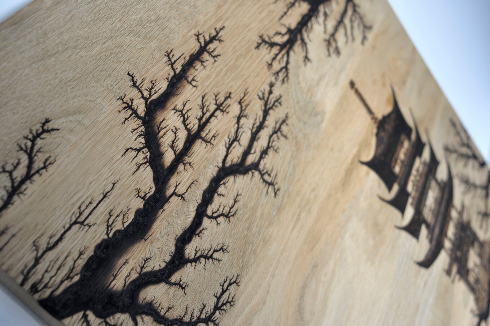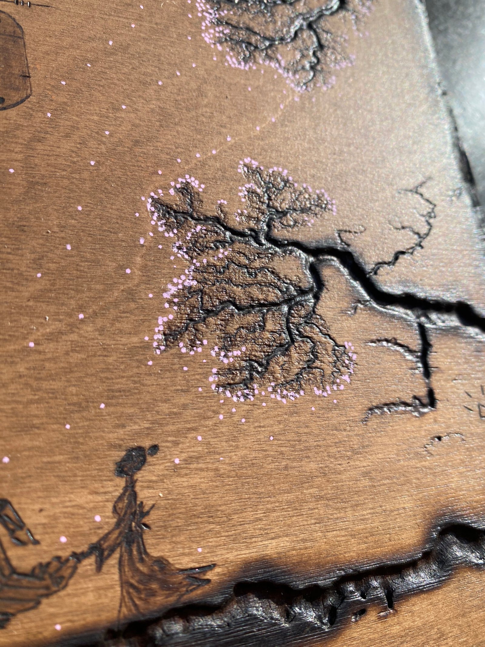 Gravure aléatoire par courant électrique (Fractales de Lichtenberg) / Pyrogravure / Peinture / Saturateur / Vernis