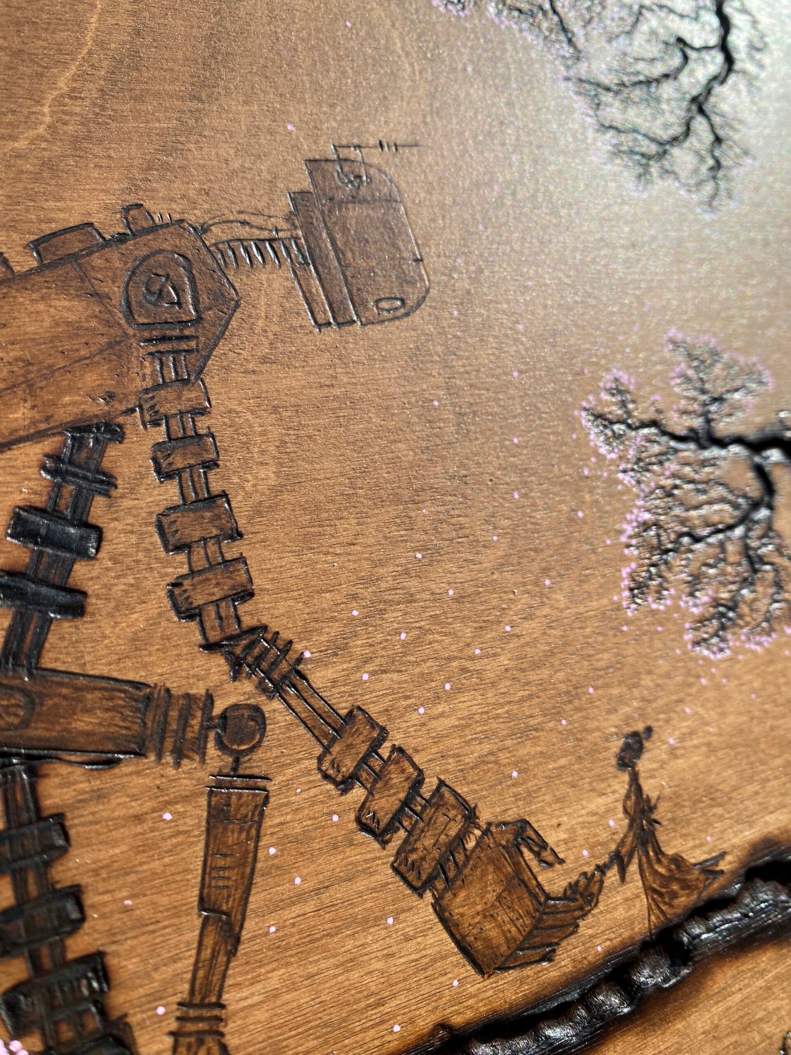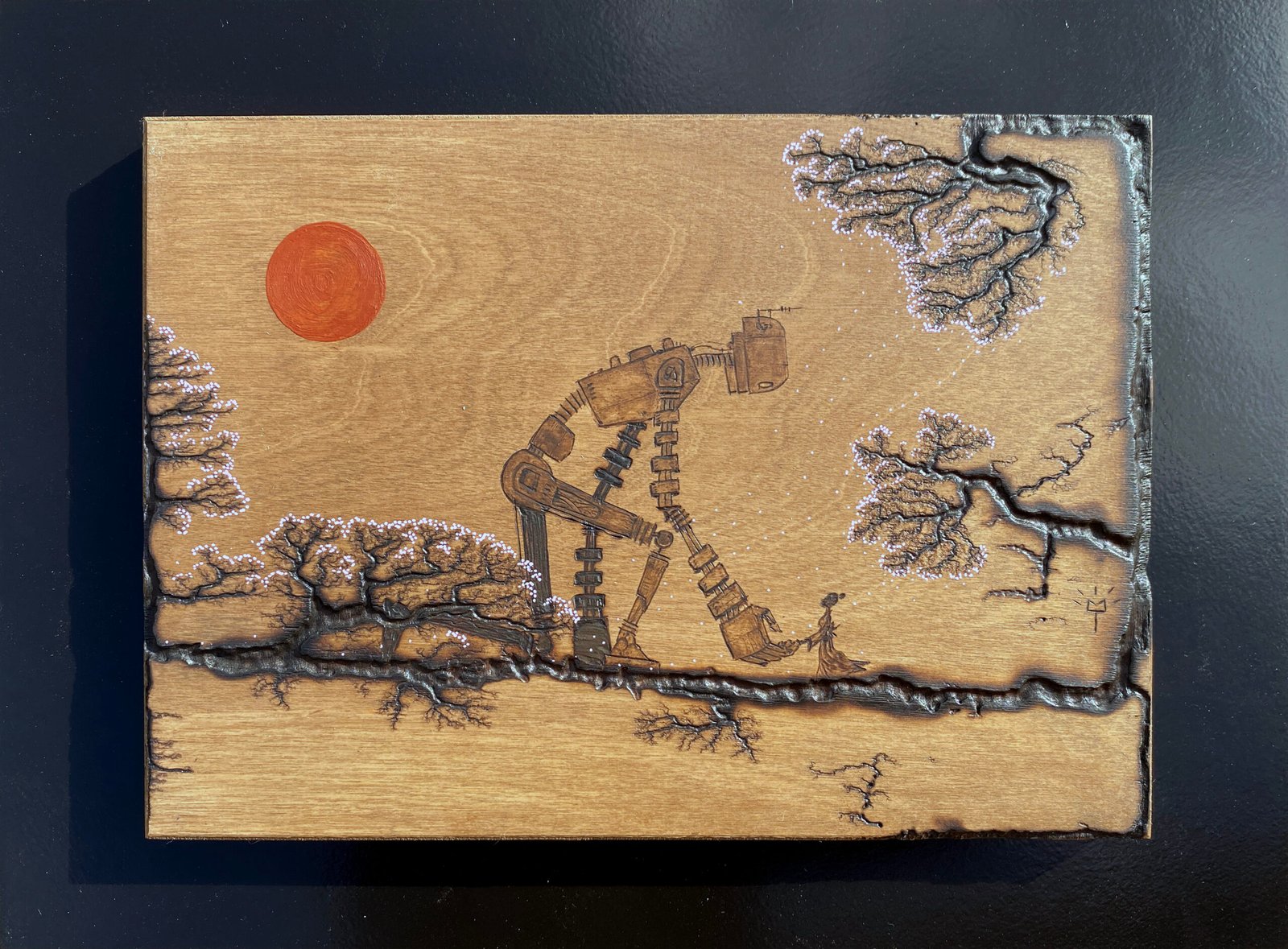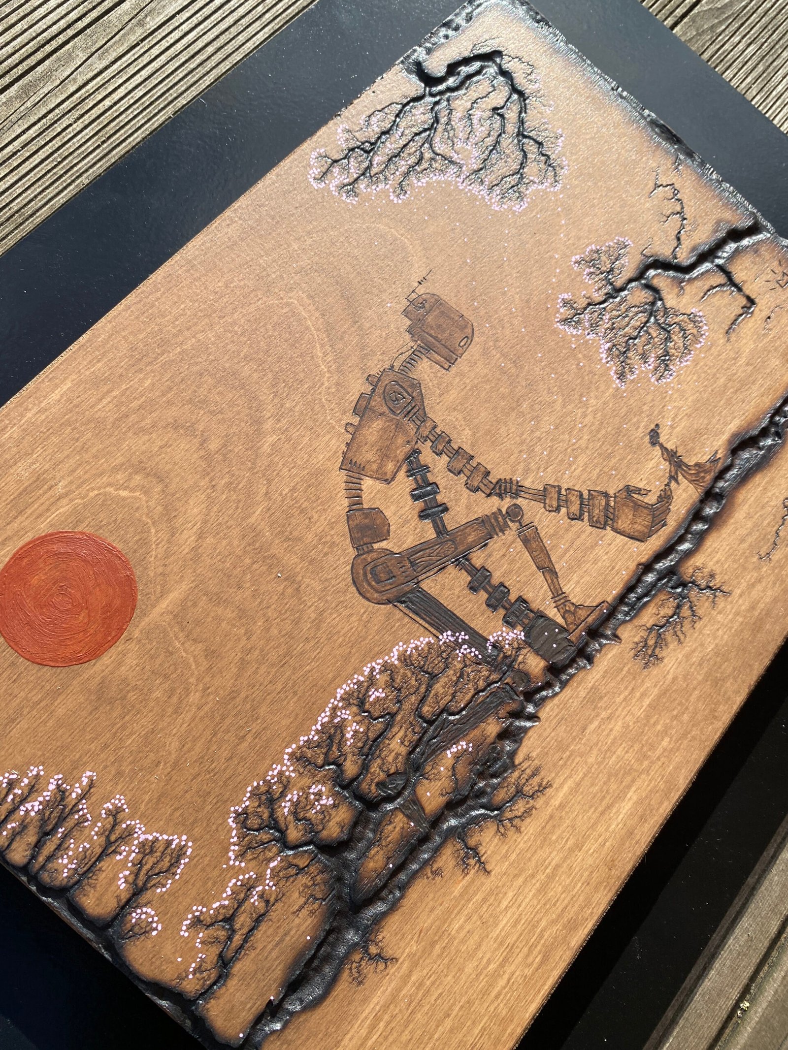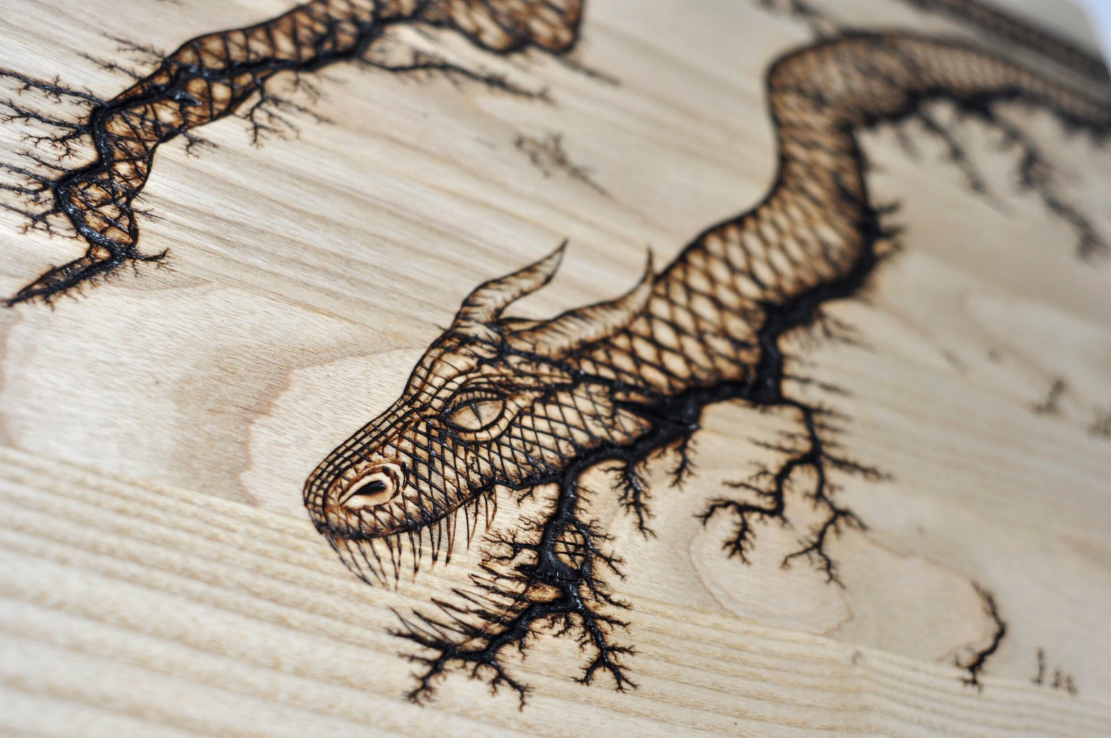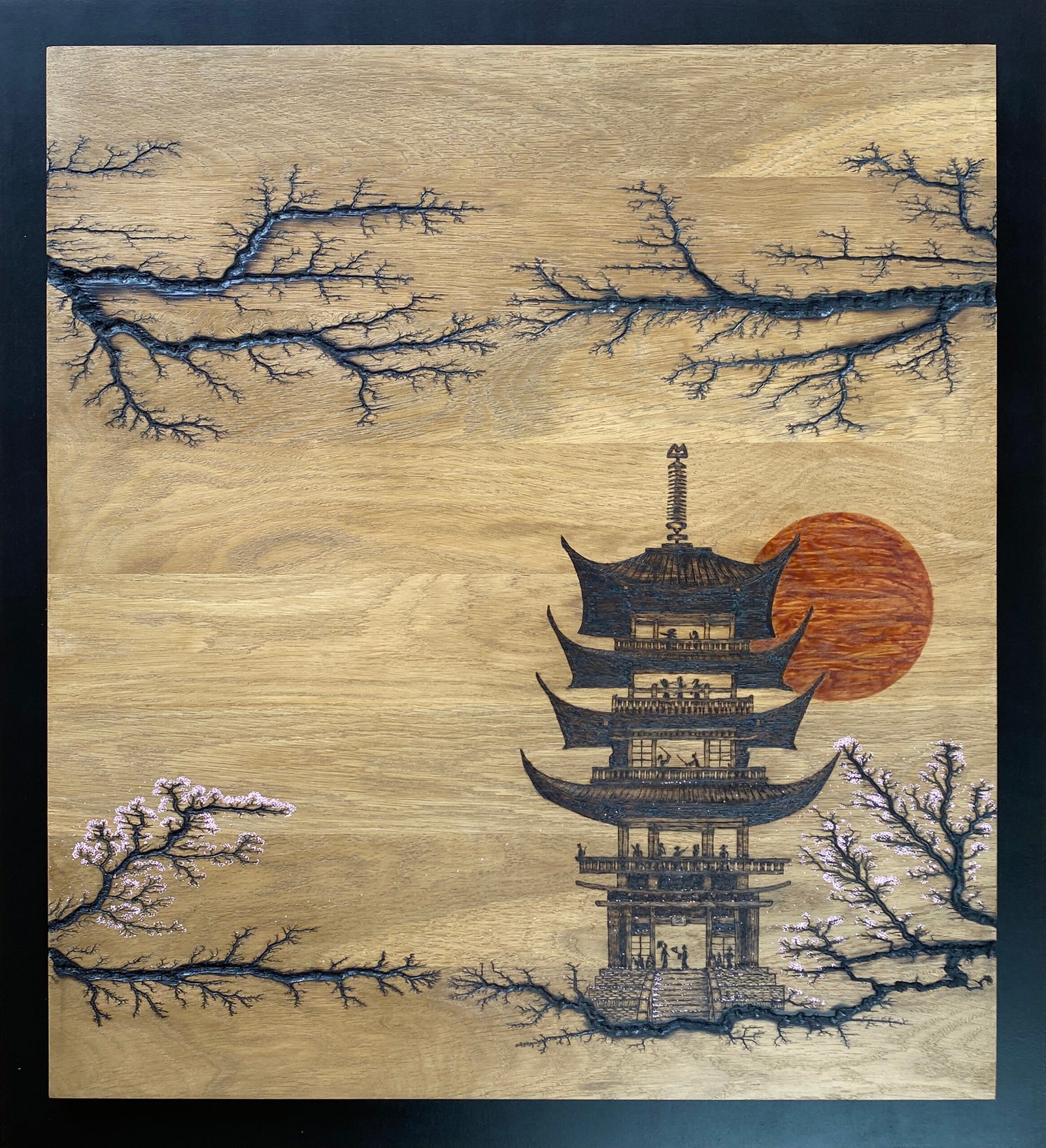 Gravure aléatoire par courant électrique (Fractales de Lichtenberg) / Pyrogravure / Peinture / Saturateur / Vernis