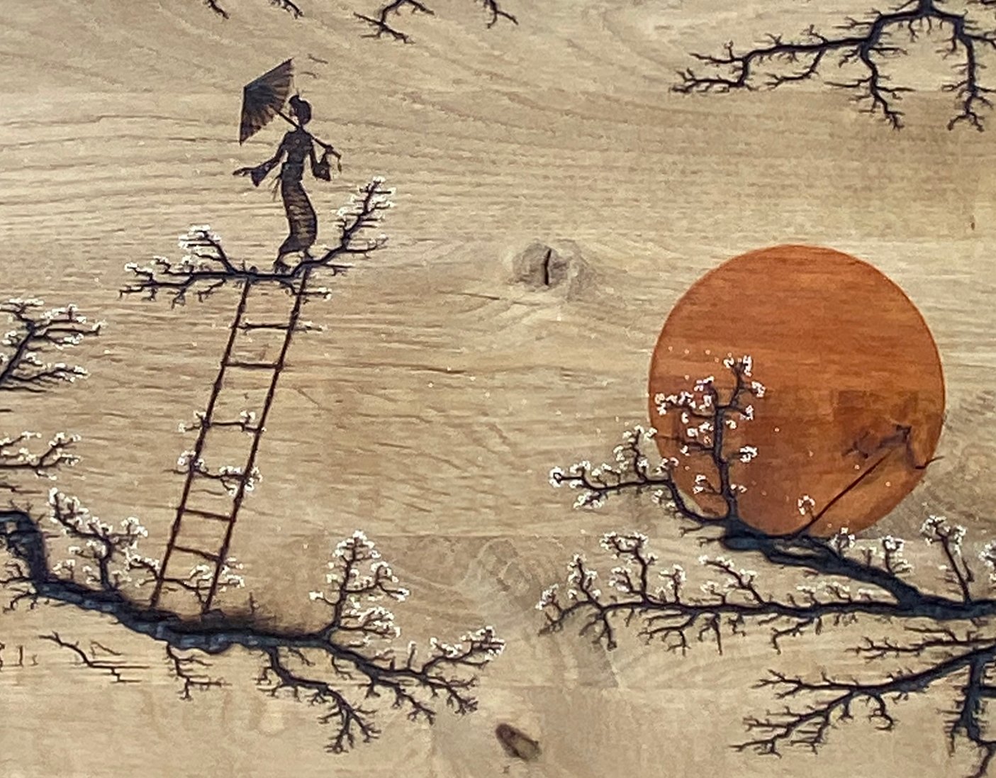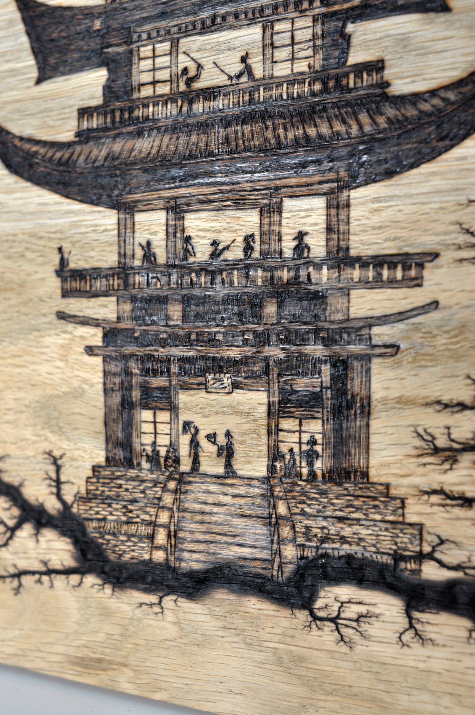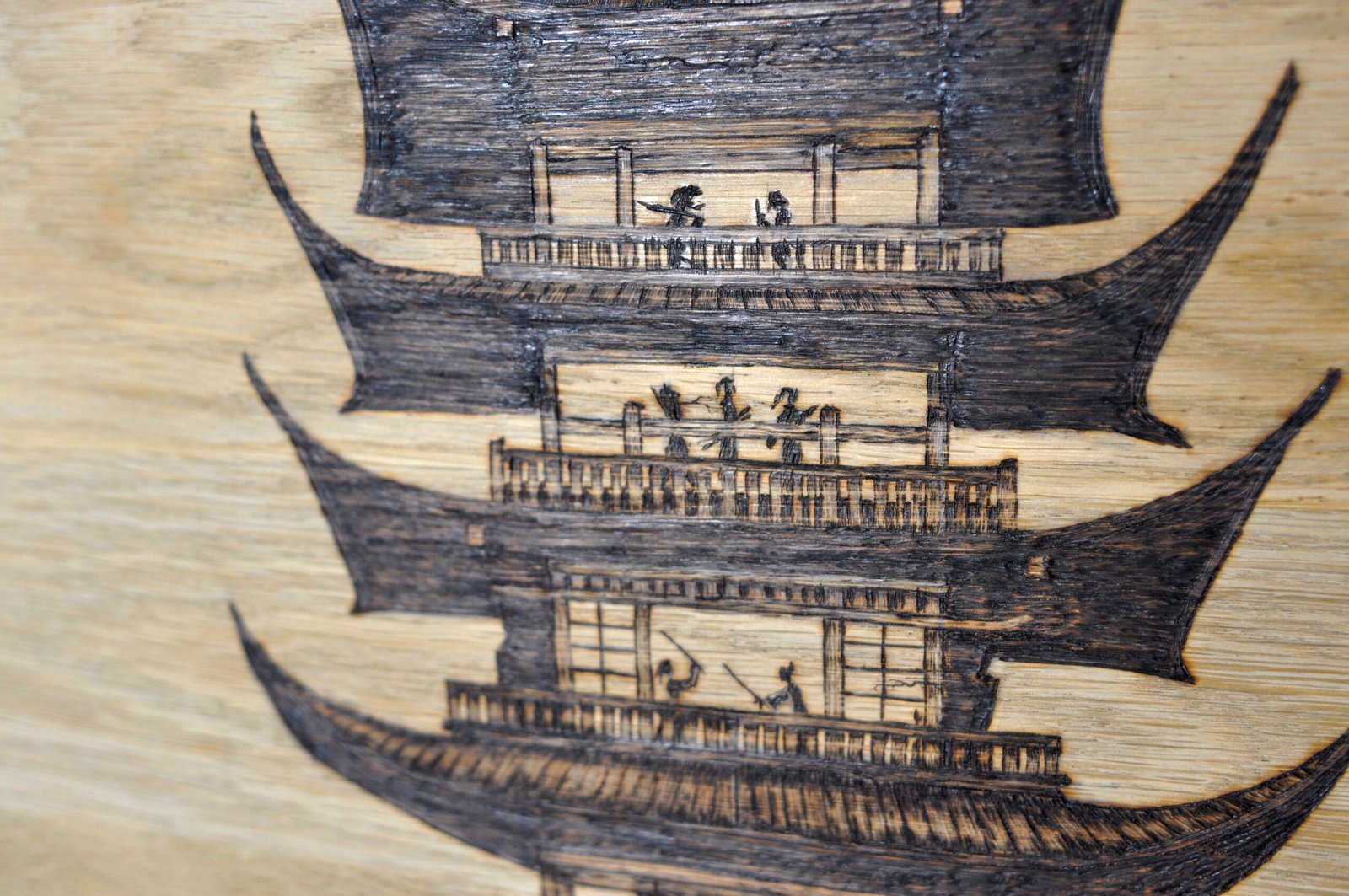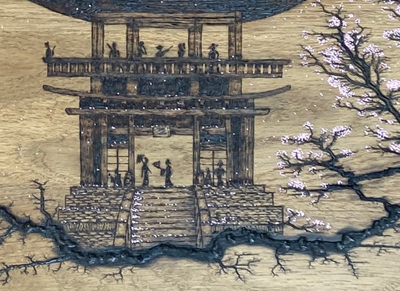 Temple pyrogravé avec des scènes à tous les étages, certaines sont des références directes à des mangas célèbres (Samourai champloo, Afro samourai et One Piece). Les cerisiers sont en fleurs, les pétales s'envolent et le soleil rougeoyant, placé très bas, est immense.