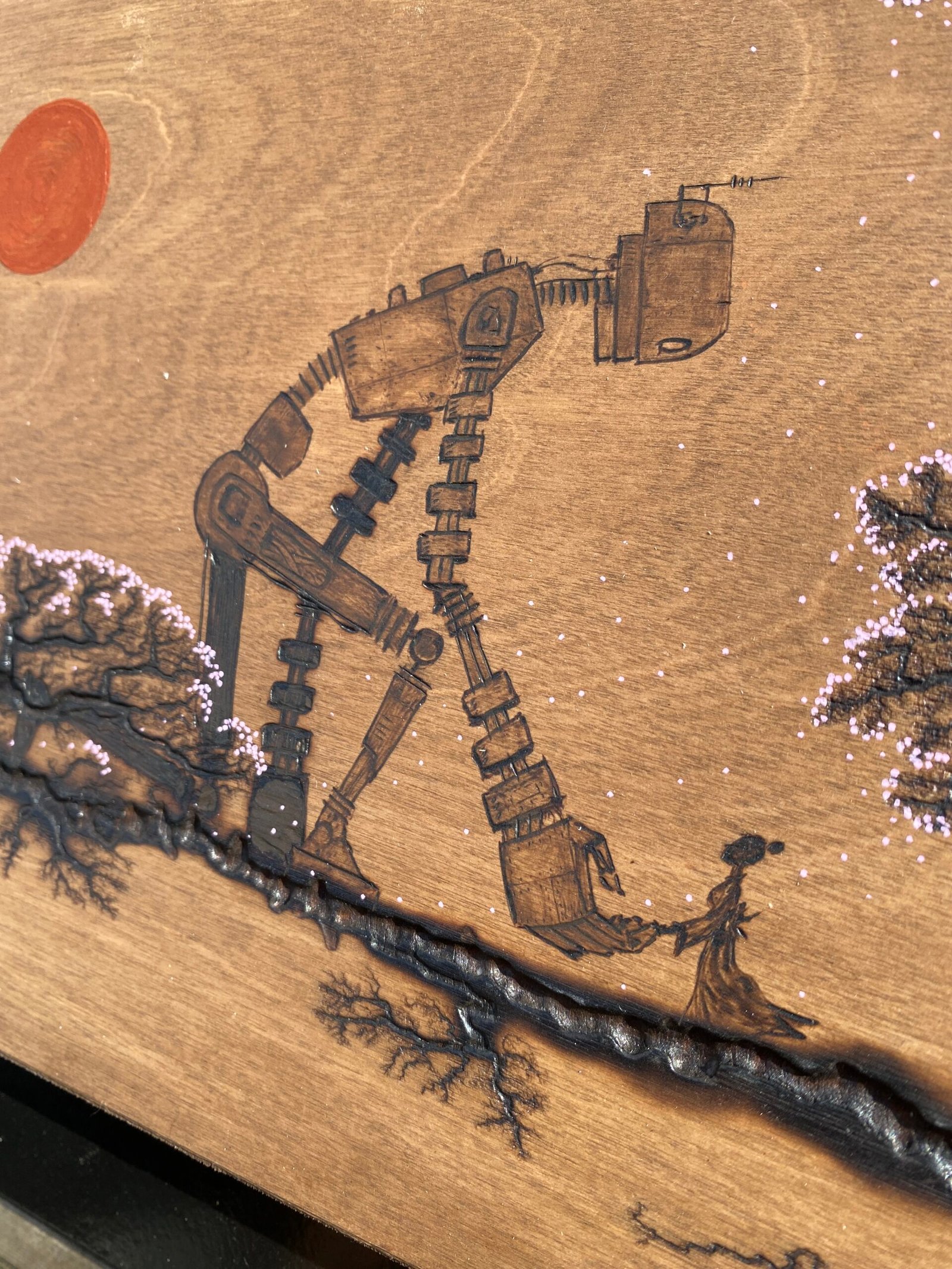 Rencontre délicate entre un robot immense et une geisha au pays du soleil levant. Les pétales de cerisiers japonais chutent en rythme du veinage du bois, une certaine tendresse se dégage de cette rencontre.