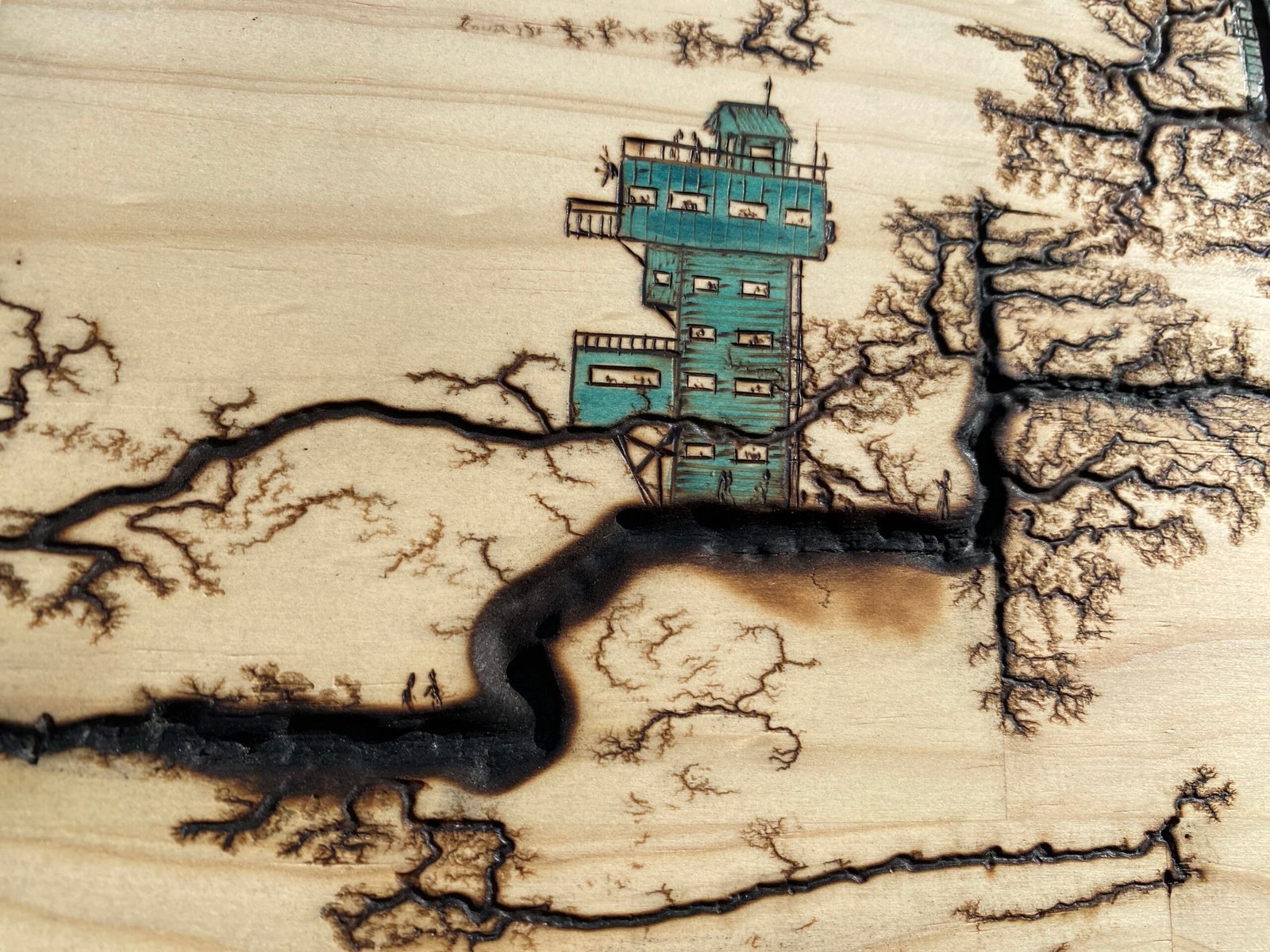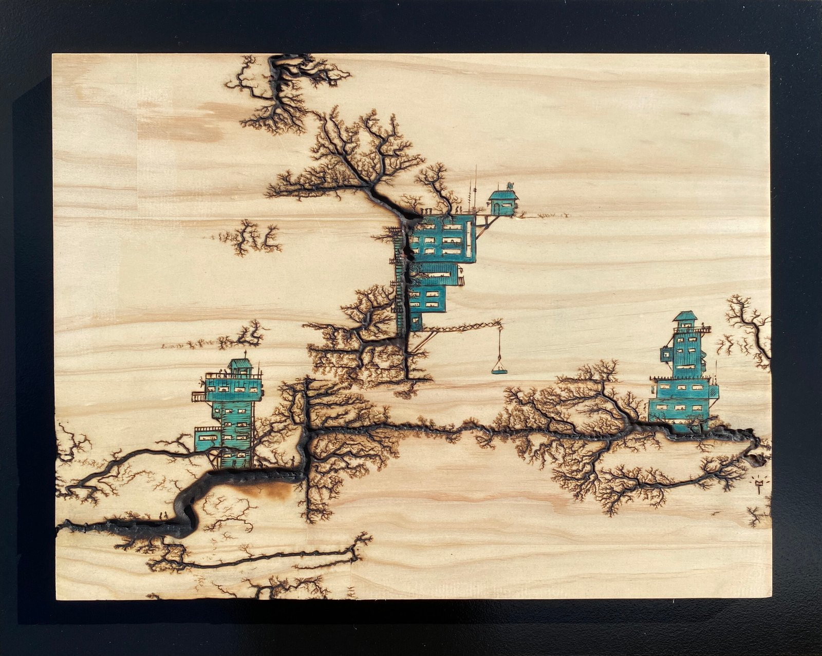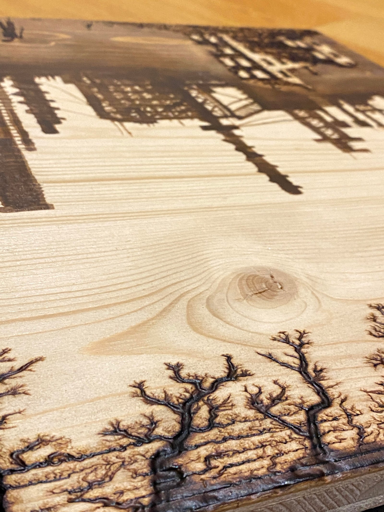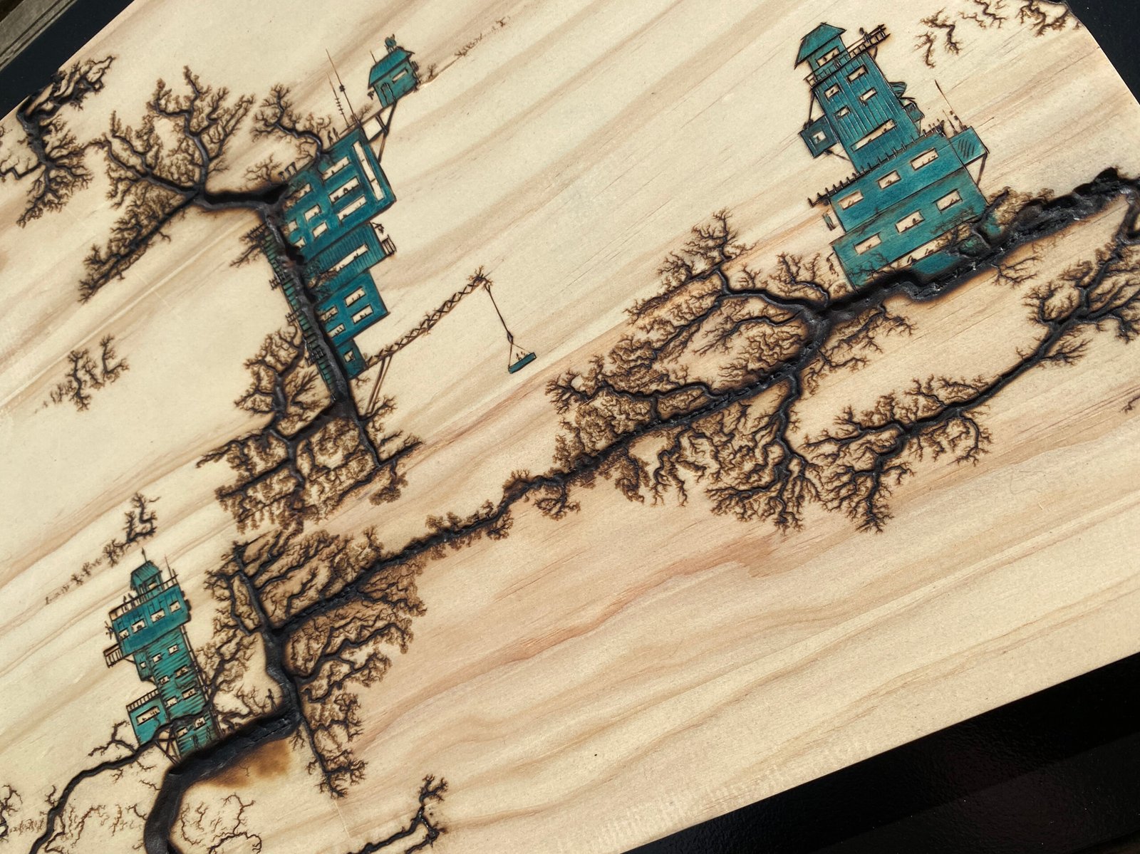 Gravure aléatoire par courant électrique (Fractales de Lichtenberg) / Pyrogravure / Peinture / Saturateur / Vernis