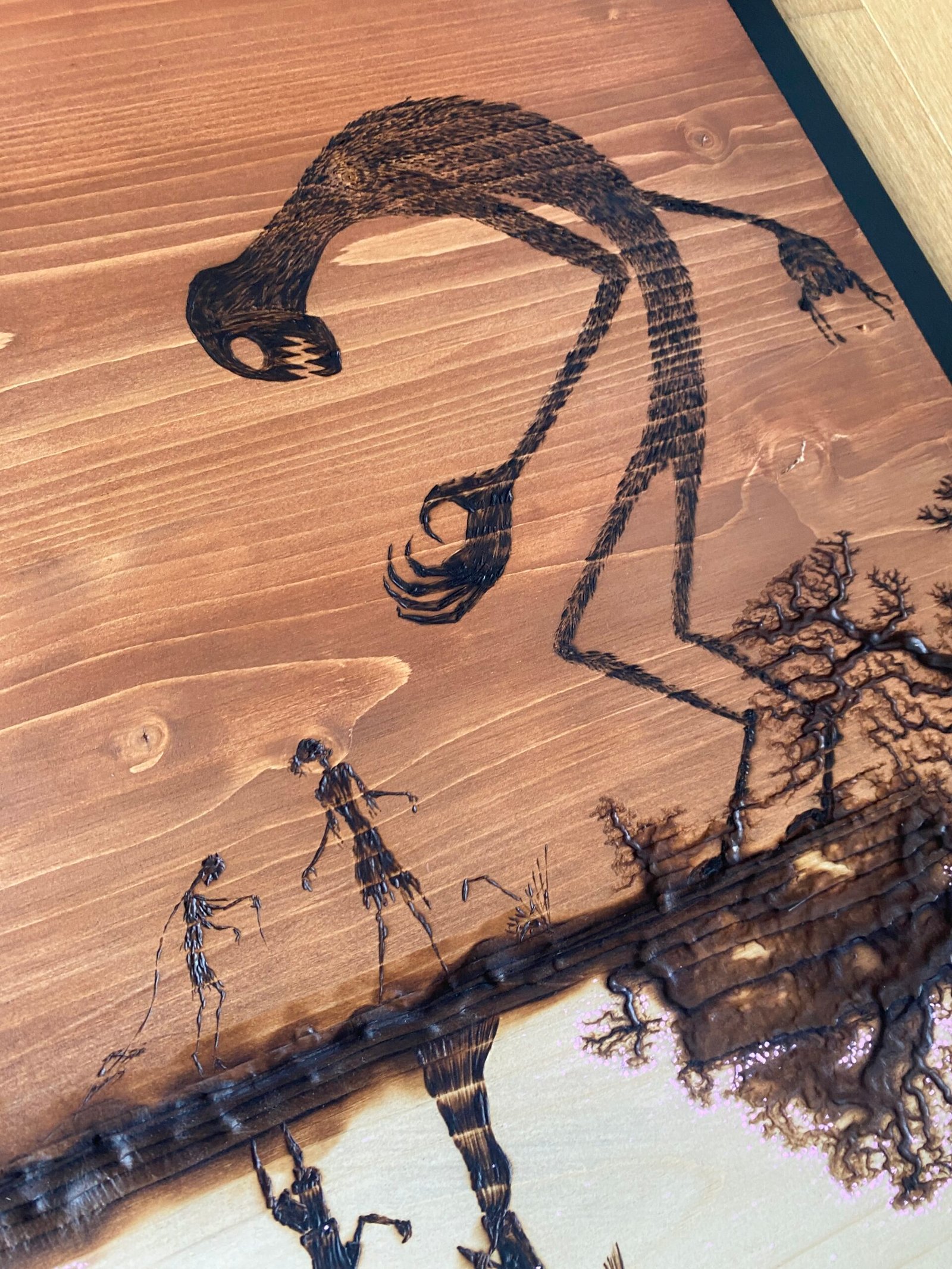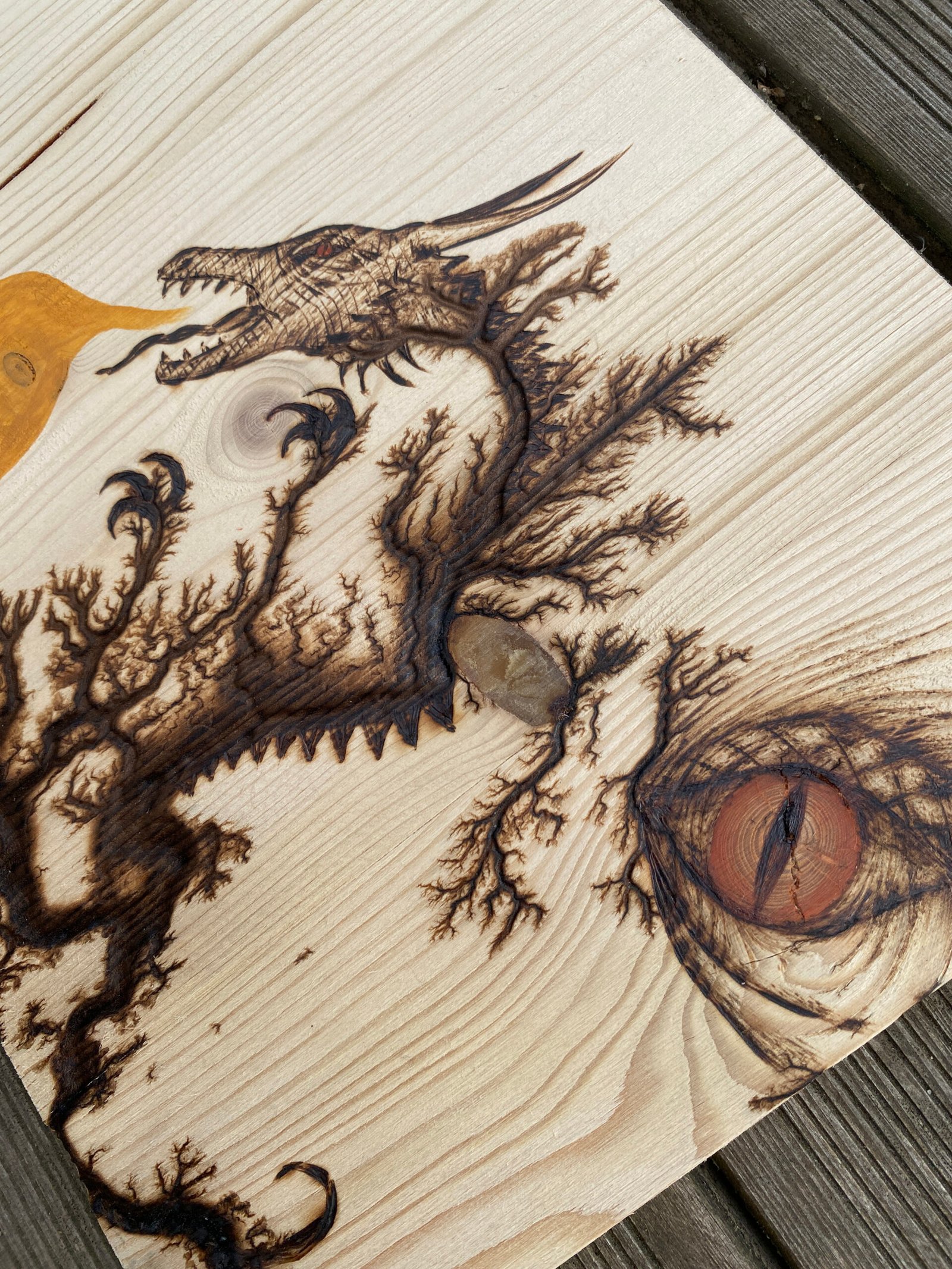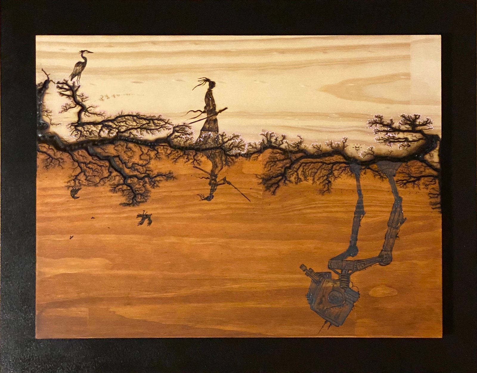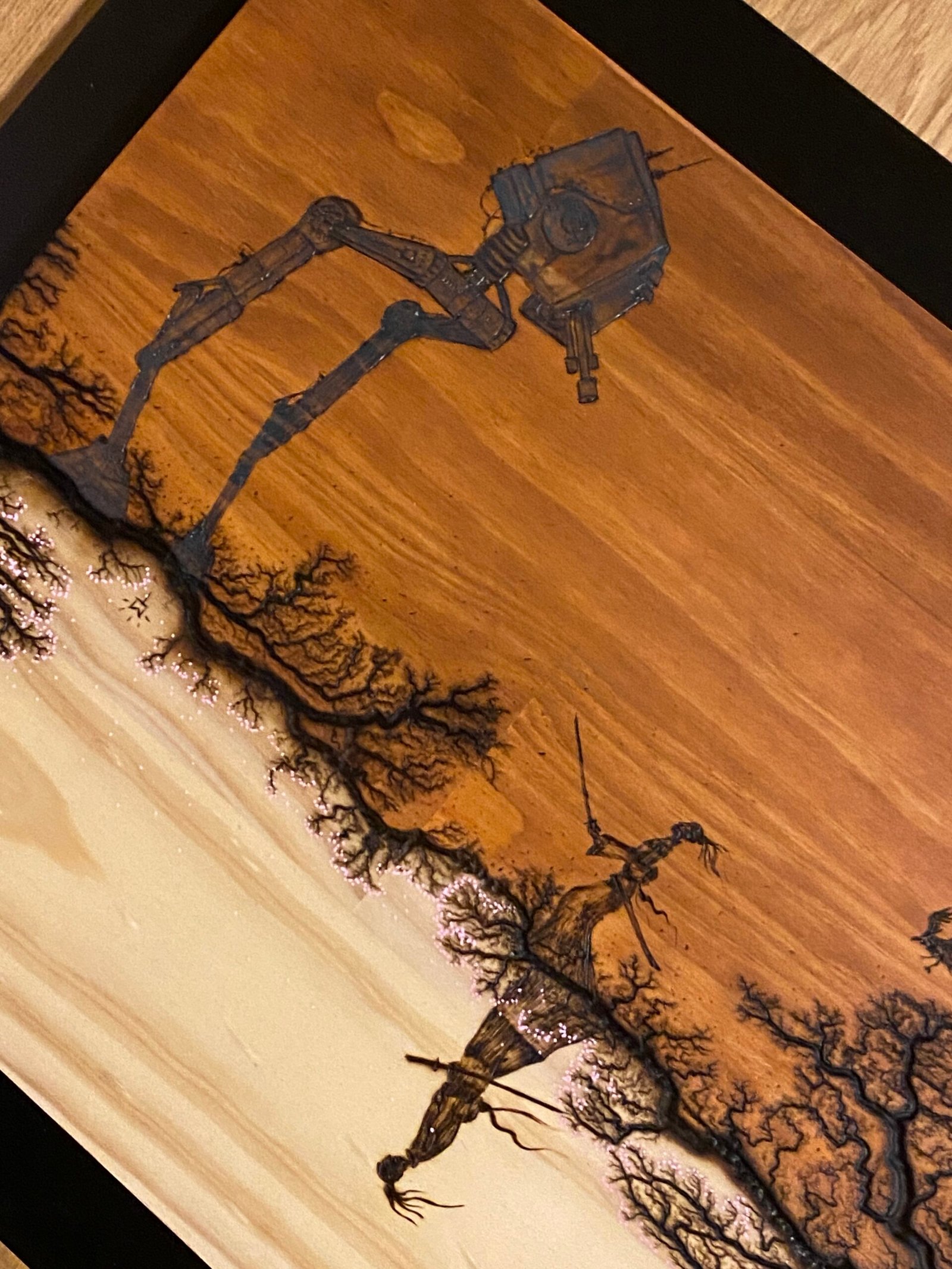 Gravure aléatoire par courant électrique (Fractales de Lichtenberg) / Pyrogravure / Peinture / Saturateur / Vernis