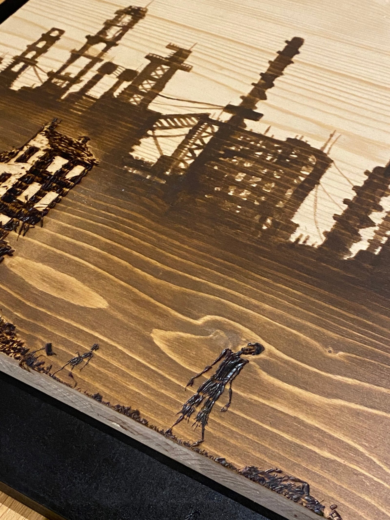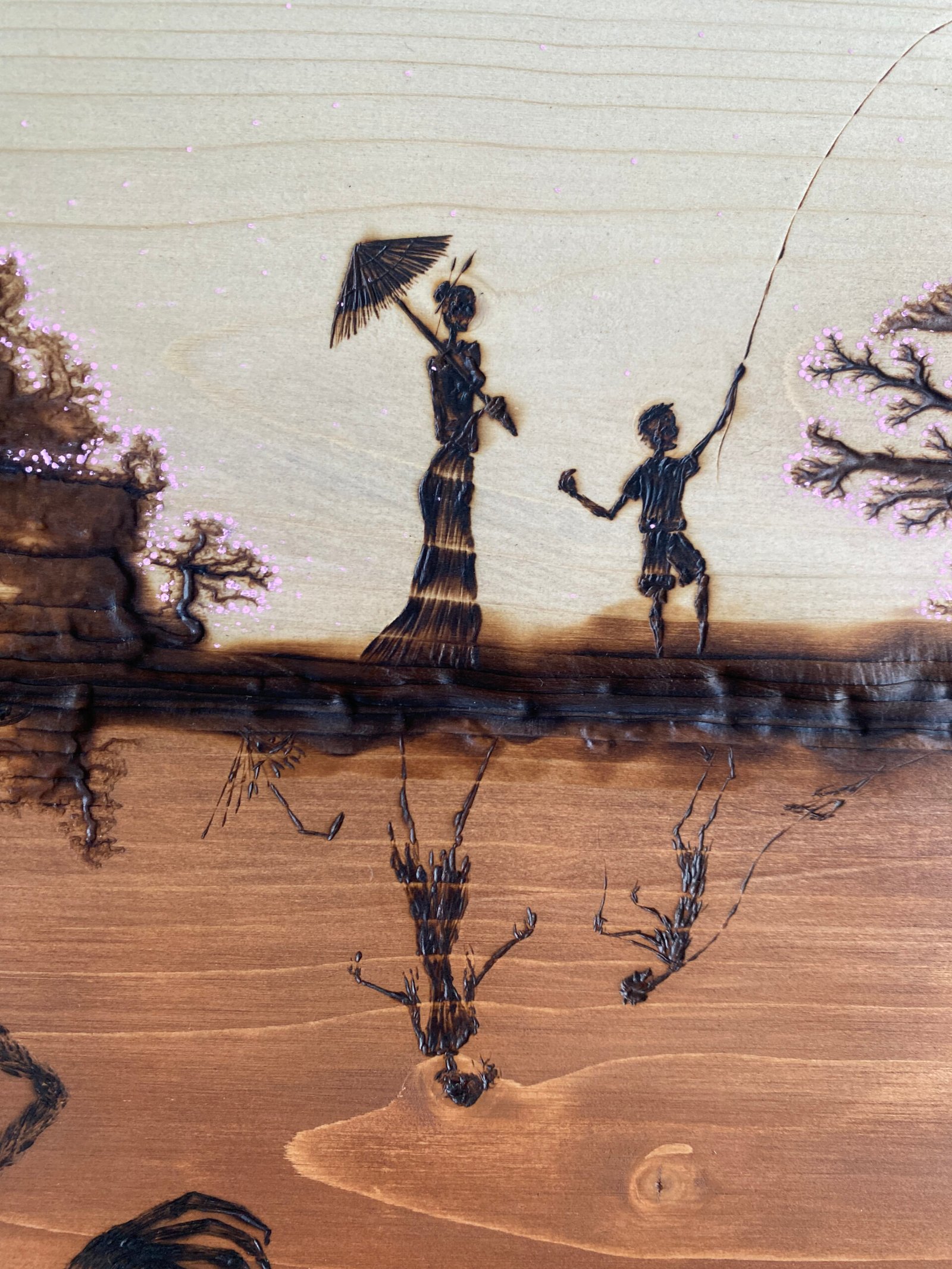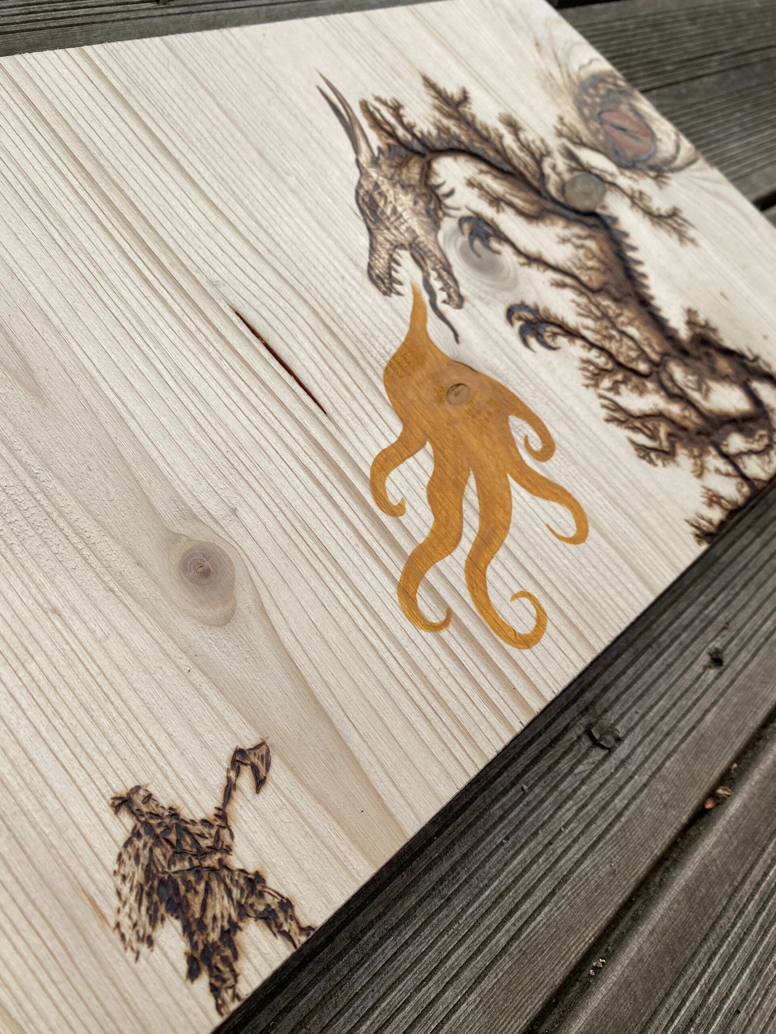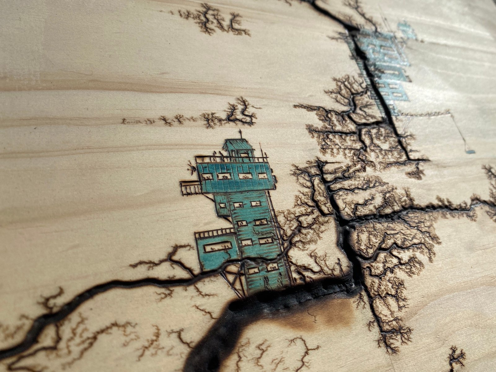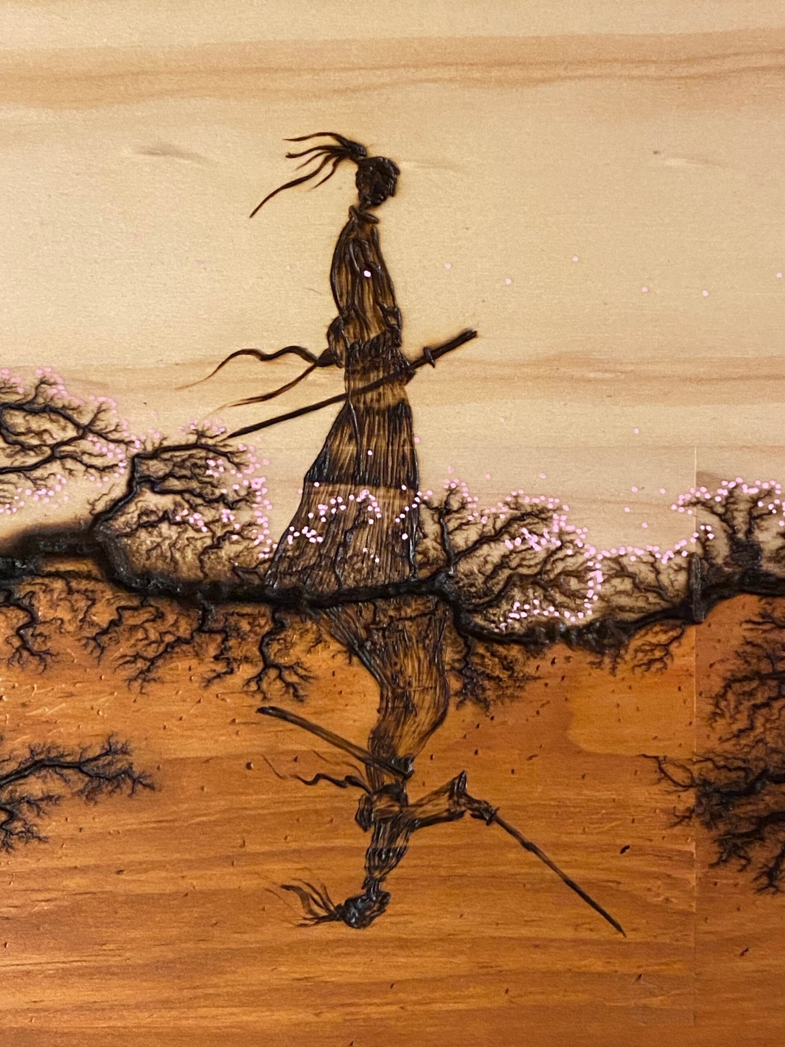 Gravure aléatoire par courant électrique (Fractales de Lichtenberg) / Pyrogravure / Peinture / Saturateur / Vernis