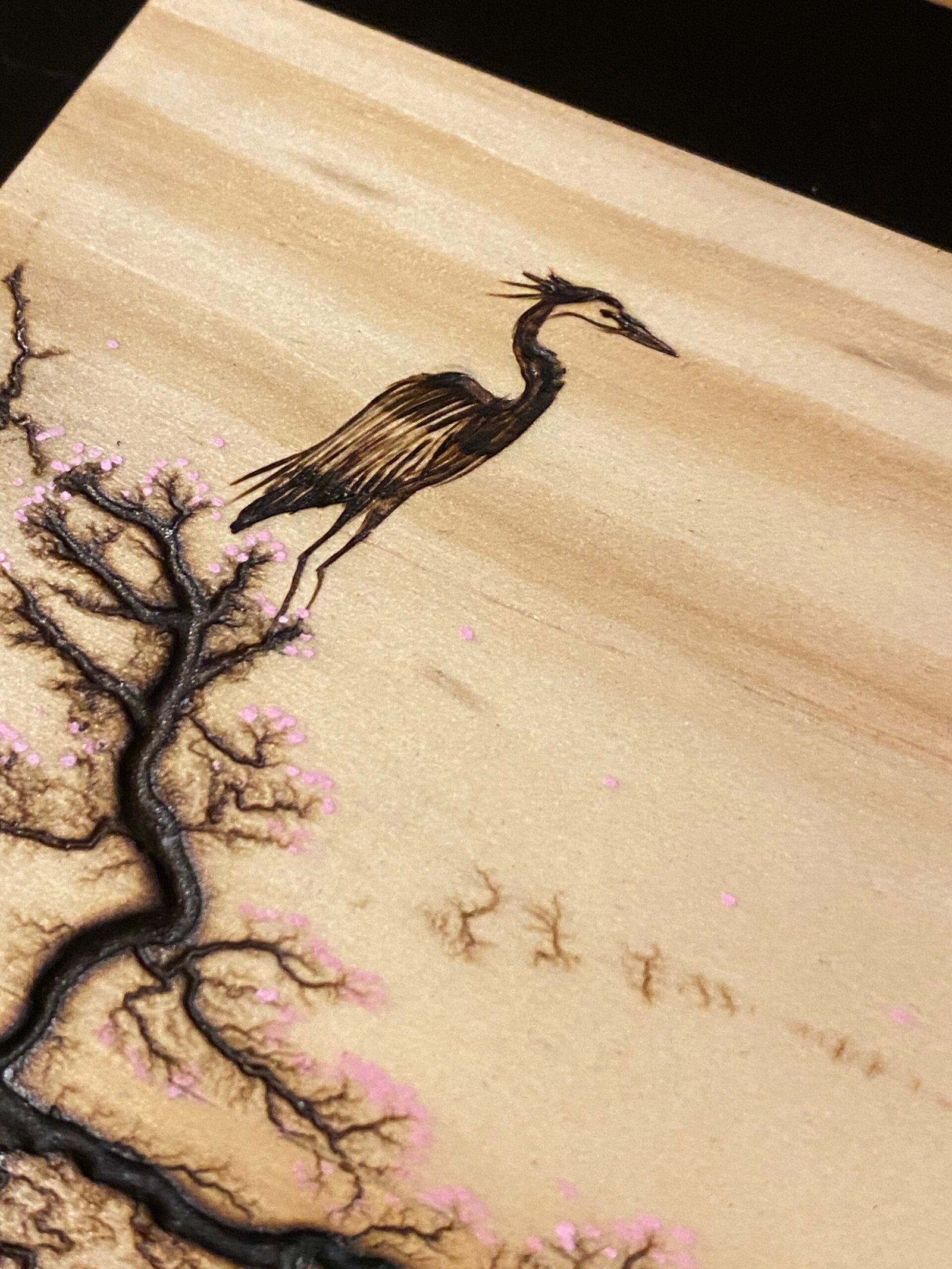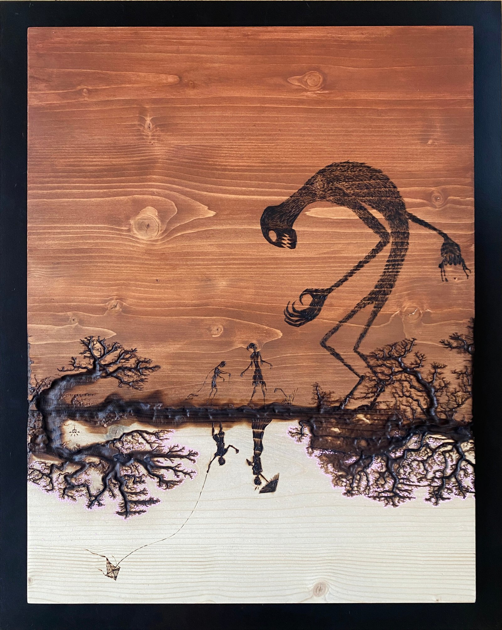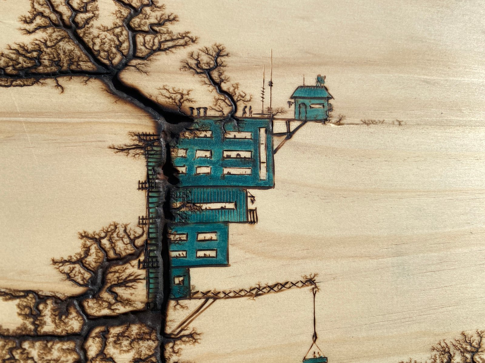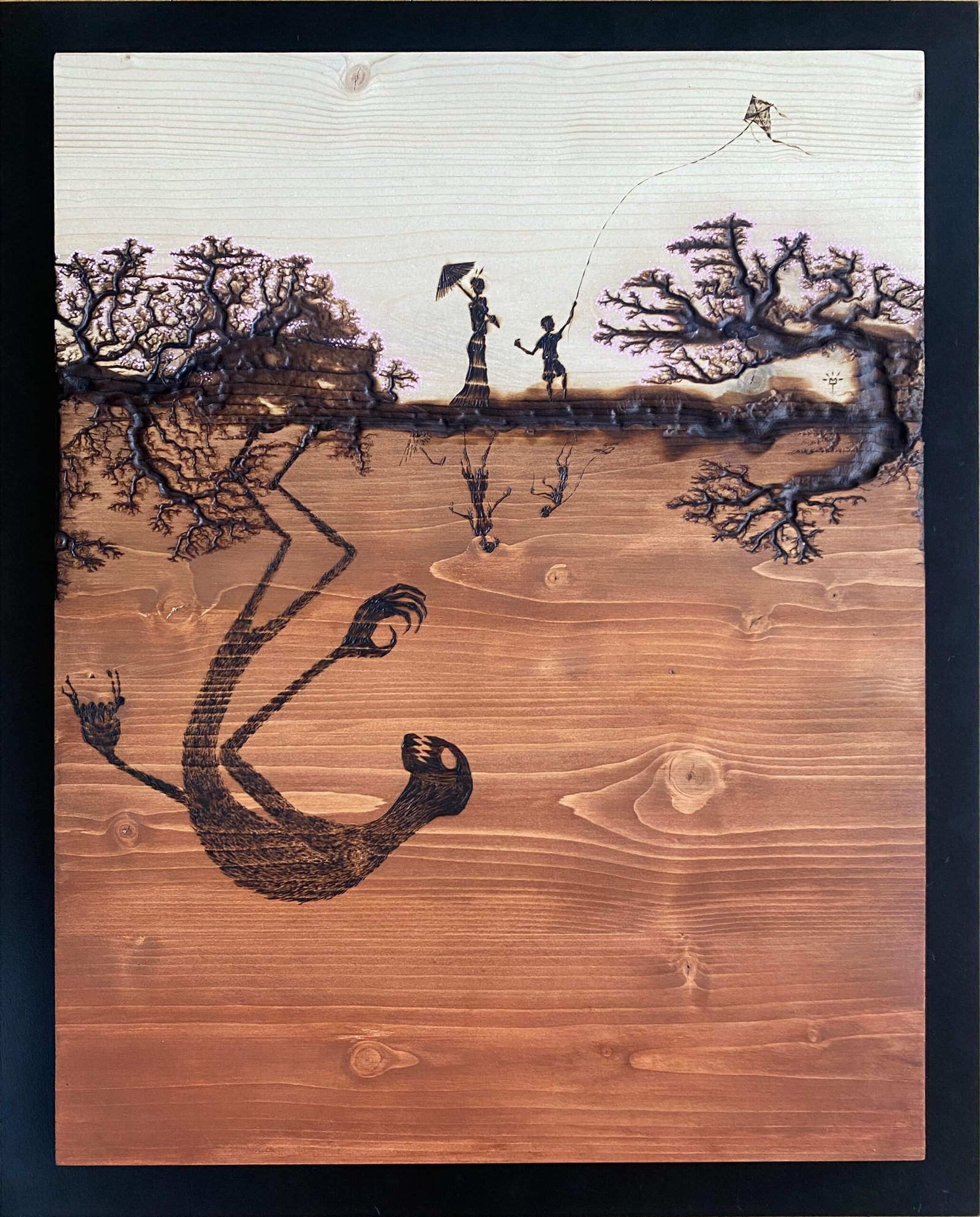 Gravure aléatoire par courant électrique (Fractales de Lichtenberg) / Pyrogravure / Peinture / Saturateur / Vernis