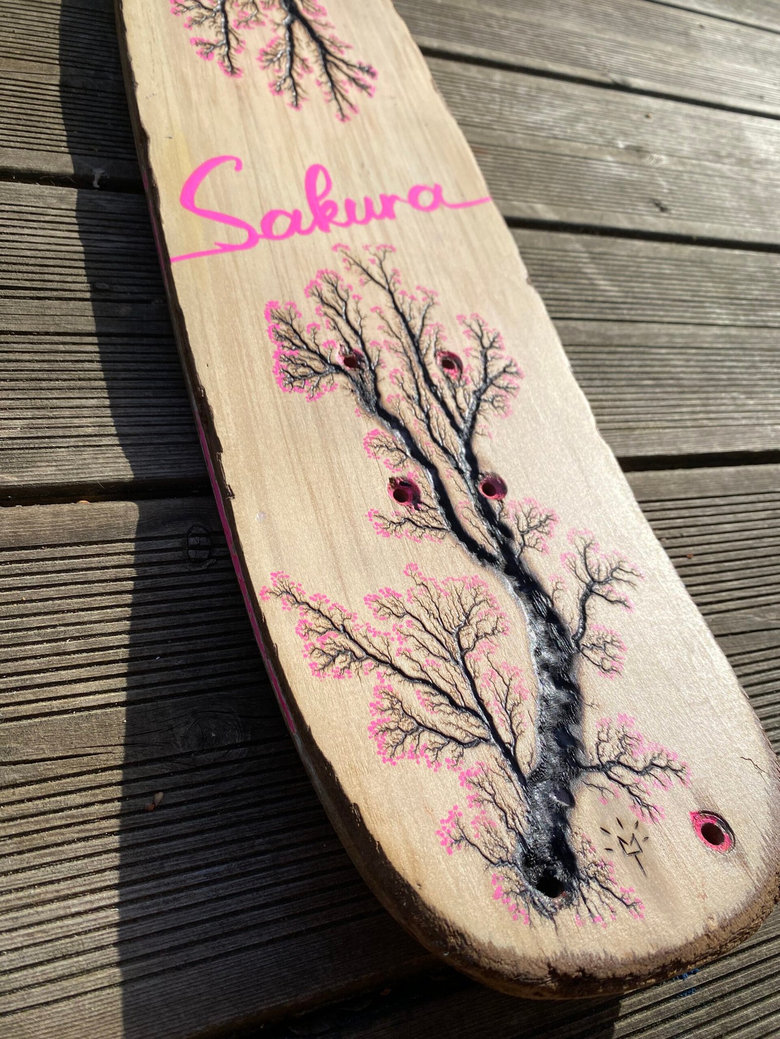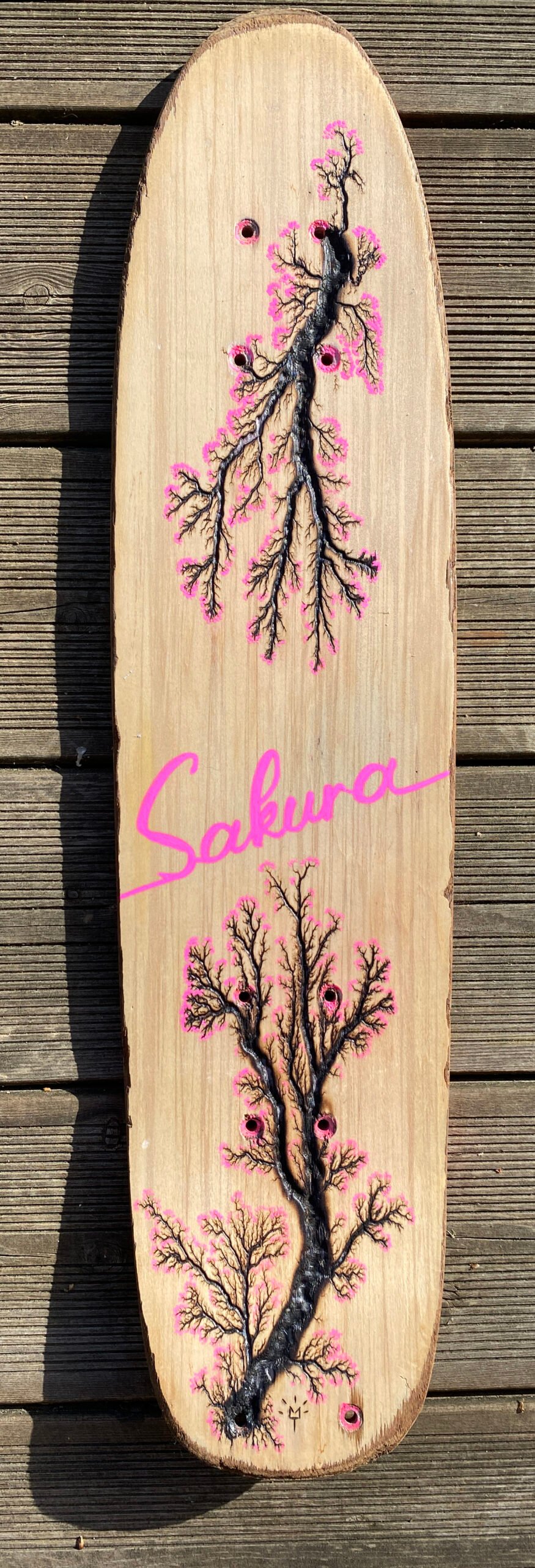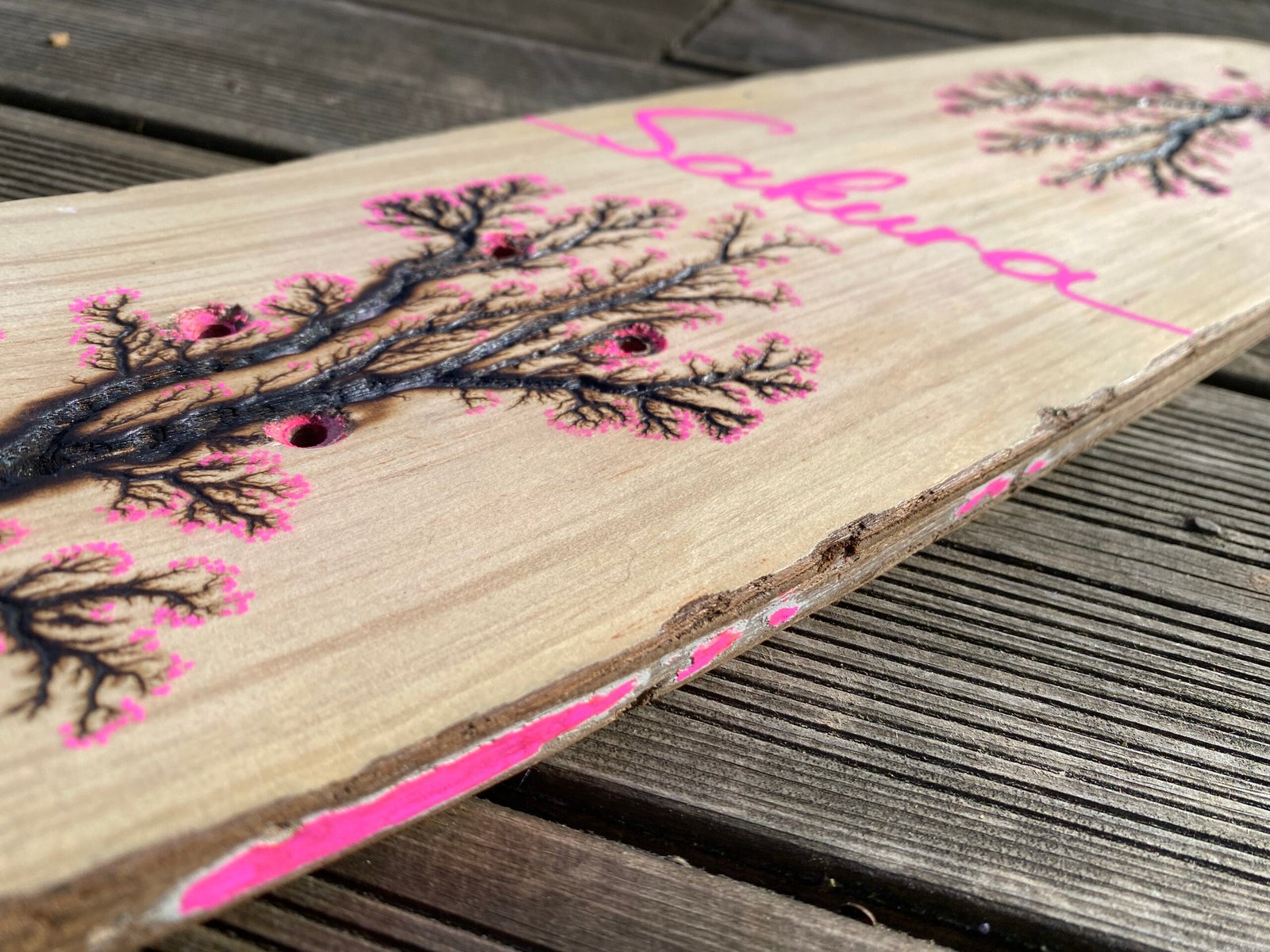 Cerisier japonais en floraison sur un skate avec la couleur d'origine, rose fluo, toujours présente sur certaines