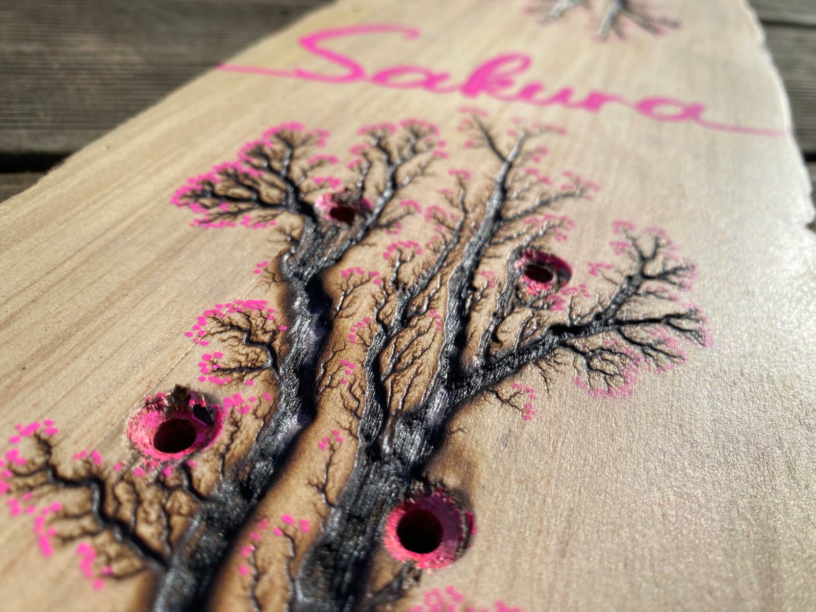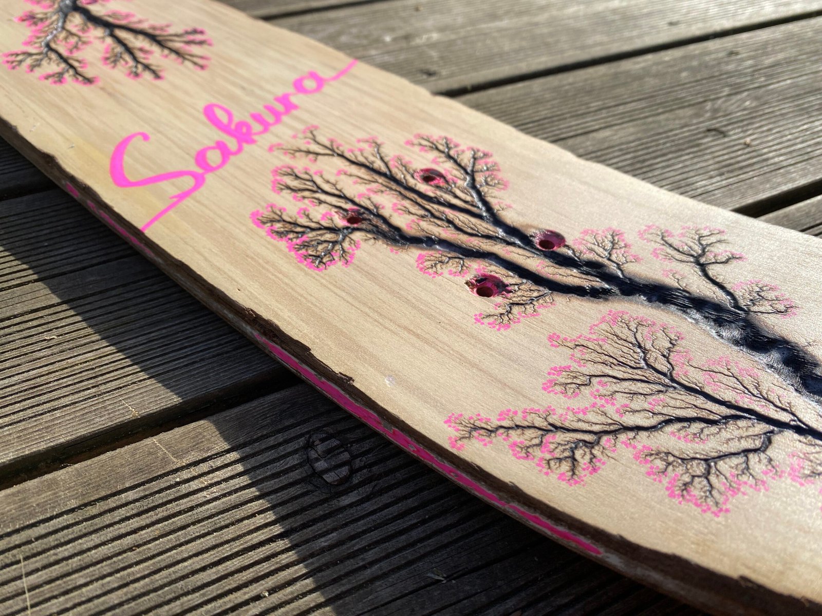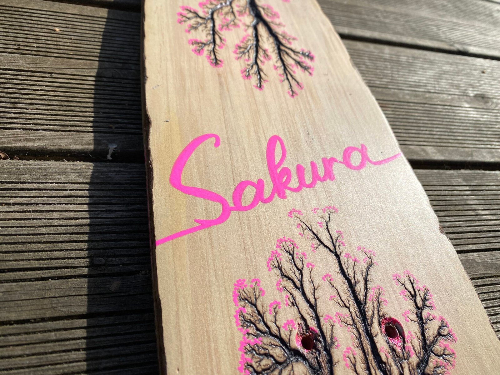 Cerisier japonais en floraison sur un skate avec la couleur d'origine, rose fluo, toujours présente sur certaines