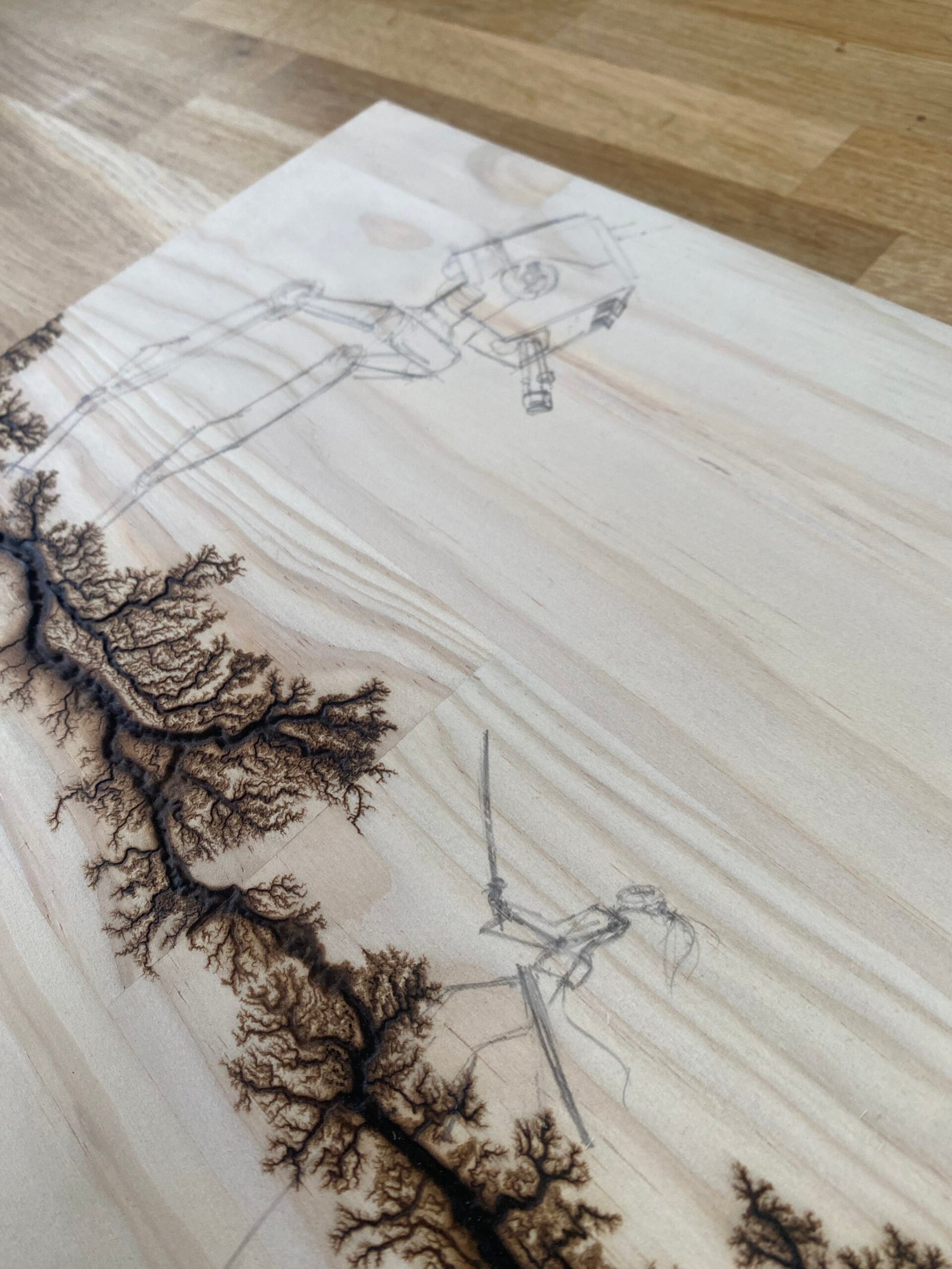 Gravure aléatoire par courant électrique (Fractales de Lichtenberg) / Pyrogravure / Saturateur