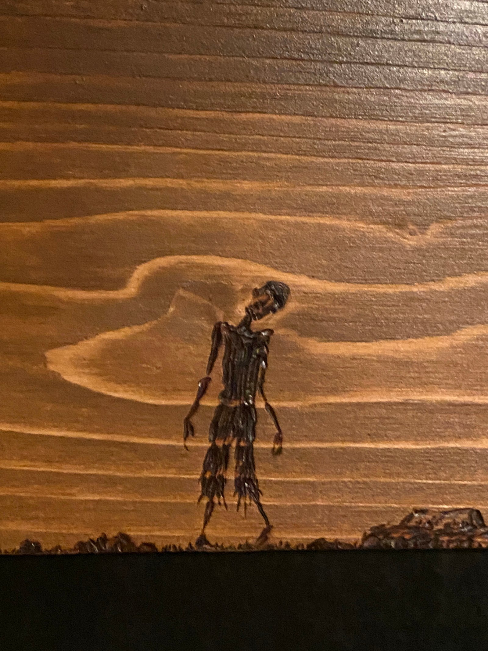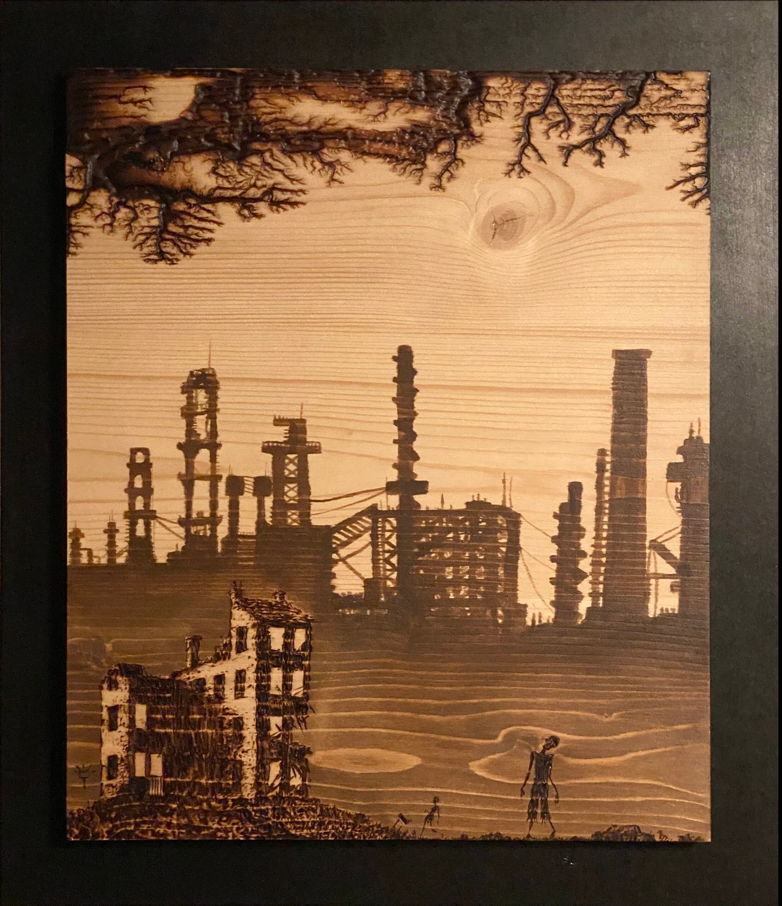 Un ciel menaçant témoigne d'un environnement toxique. La faute à l'homme est à ses industries envahissantes, polluantes et destructrices. La maison en premier plan est en ruine et des zombies peinent à se déplacer. Celui sur la droite a son crâne à la place d'un nœud de bois et le veinage semble faire divaguer la silhouette maigrichonne.