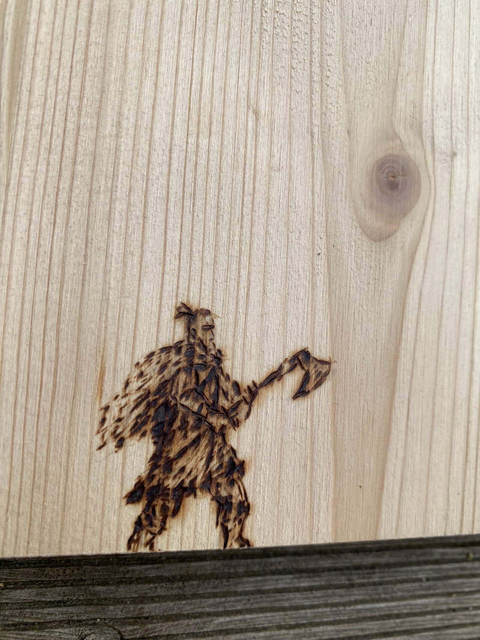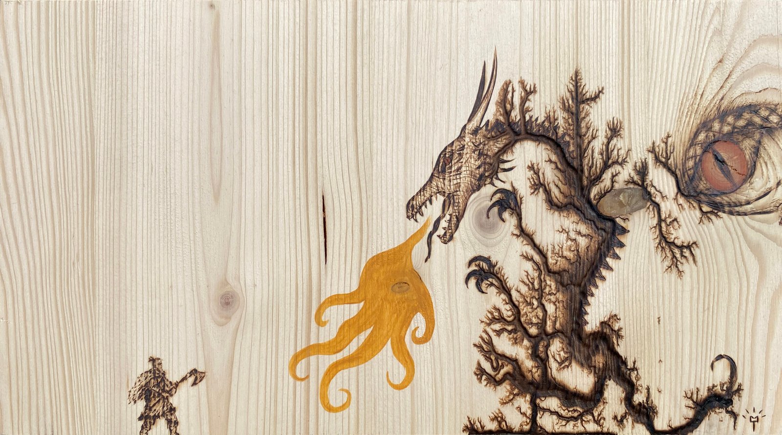 Ce dragon aux formes obscures lance ses flammes contre un petit viking prêt à en découdre avec sa hache. Un joli noeud m'a permis de faire un focus de l'oeil du dragon.