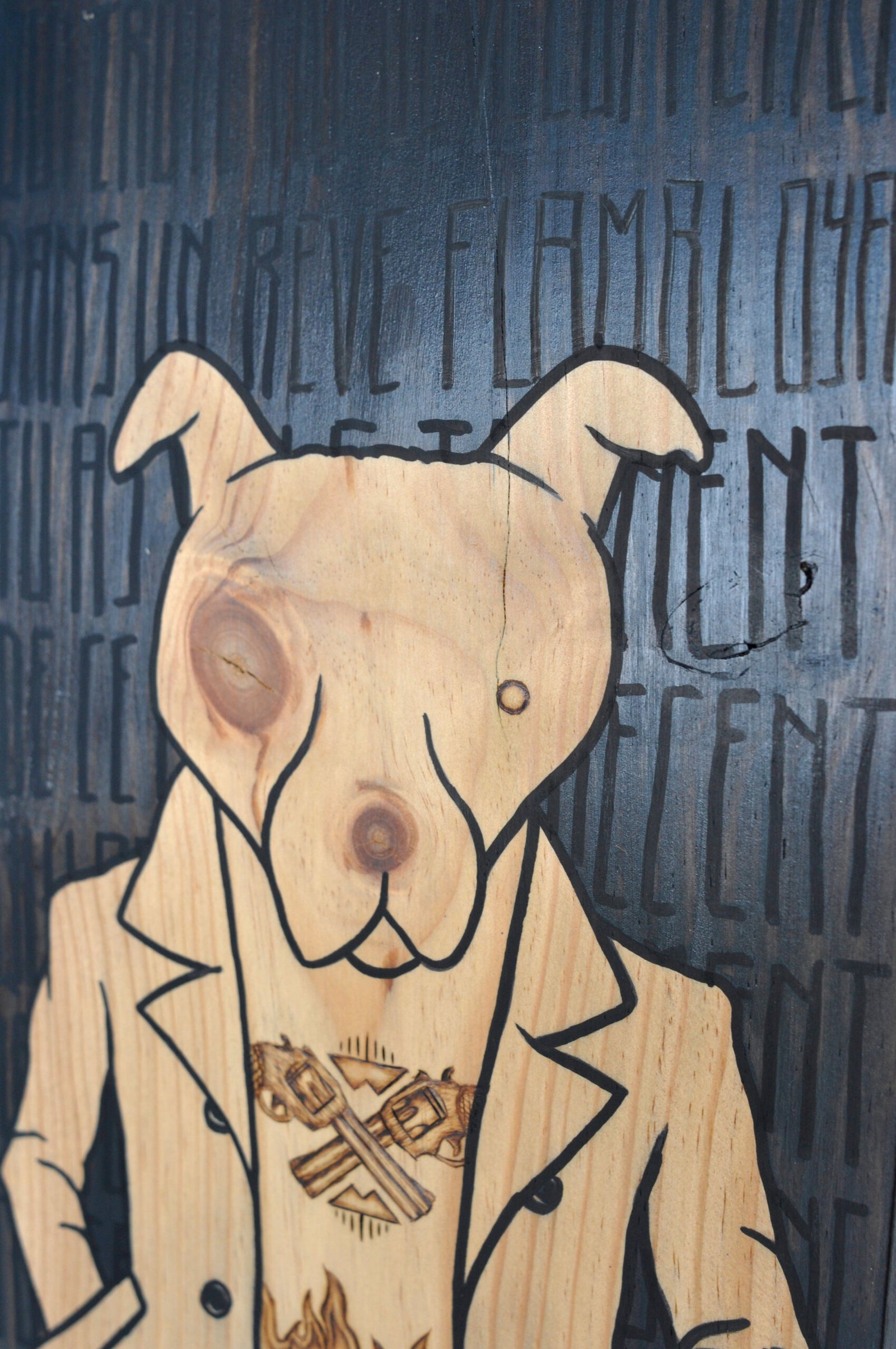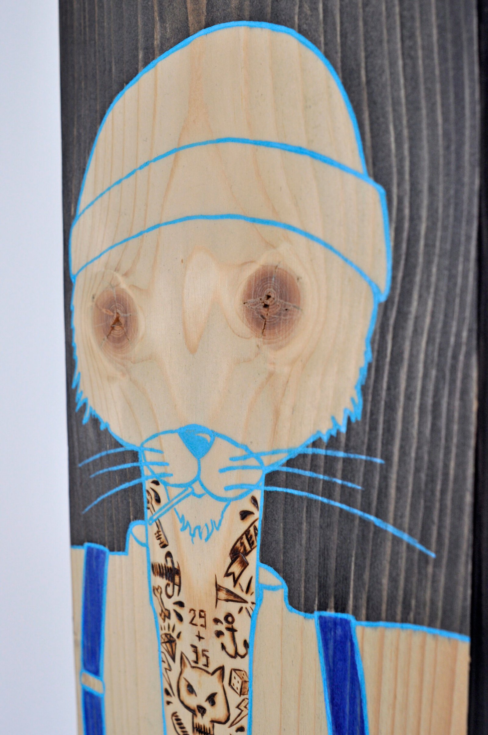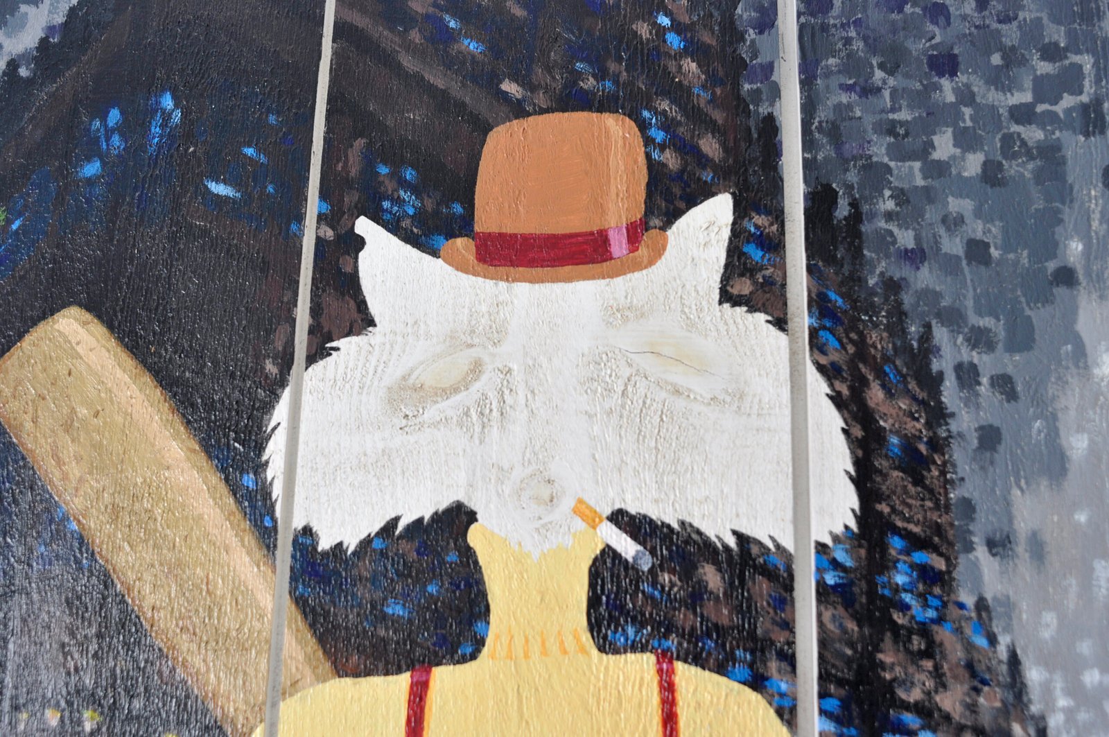 Utilisation des nœuds pour les yeux et la truffe de notre renard. Ambiance de pubs britishs et de brouillard pour ce portrait de baggareur à l'anglaise. Deux styles de peinture et un parti pris, laisser au bois sa zone d'expression sans intervention. L'effet de pelage est mis en exergue par la matière pelucheuse du bois brut.