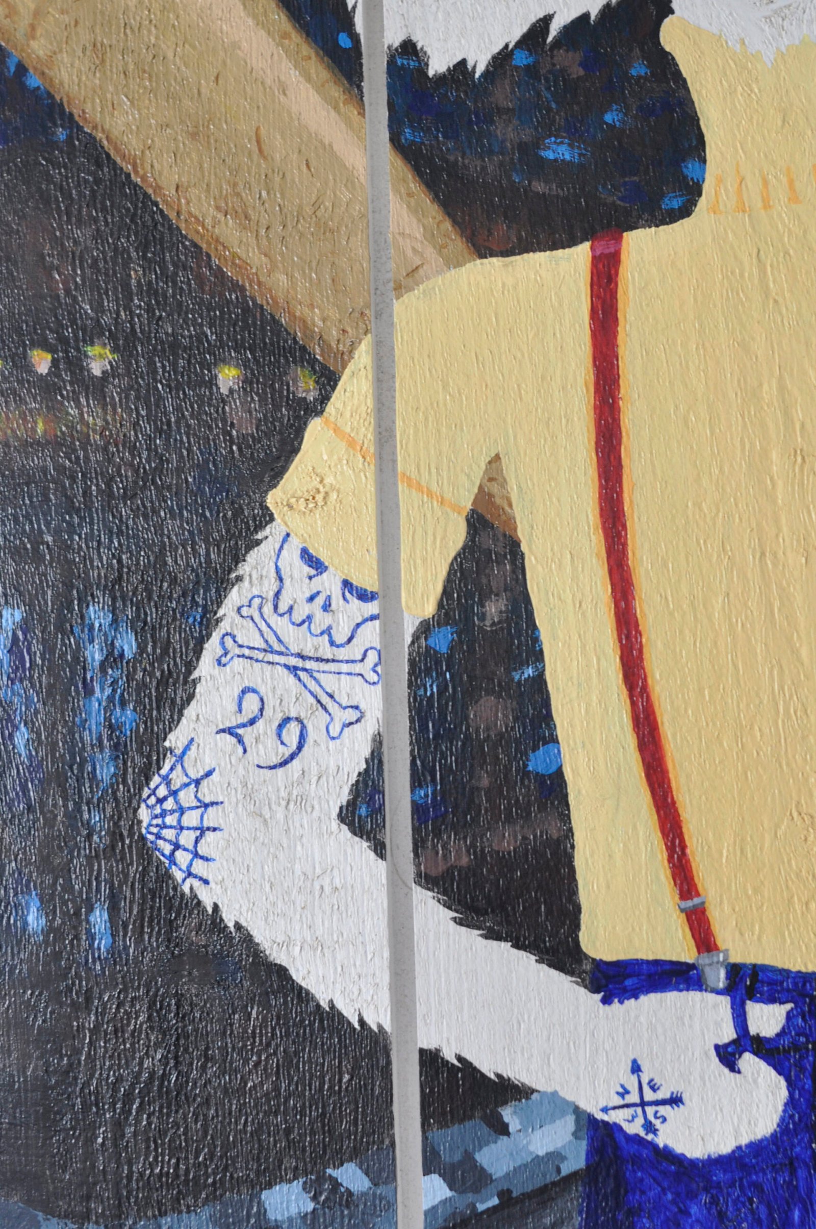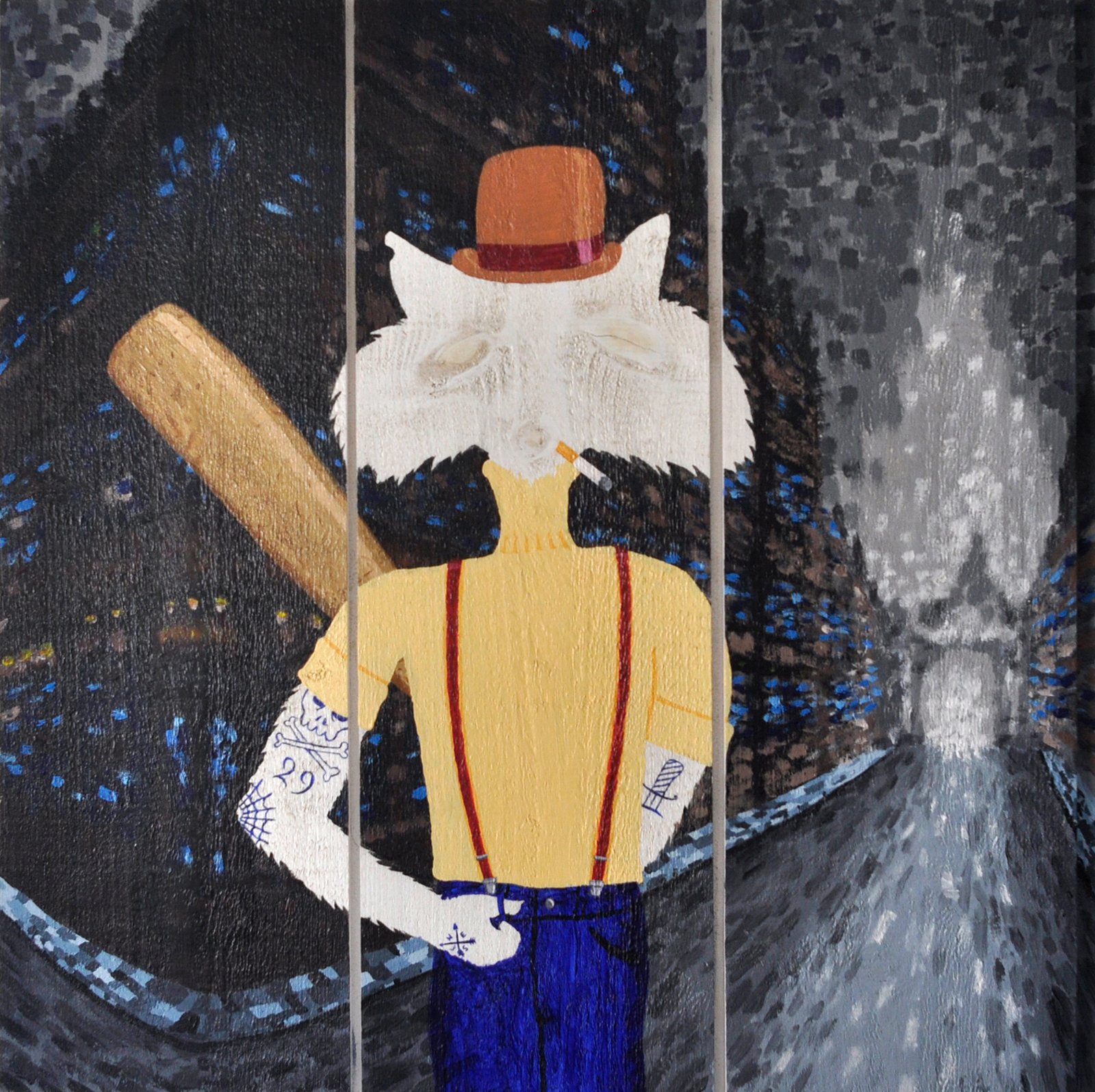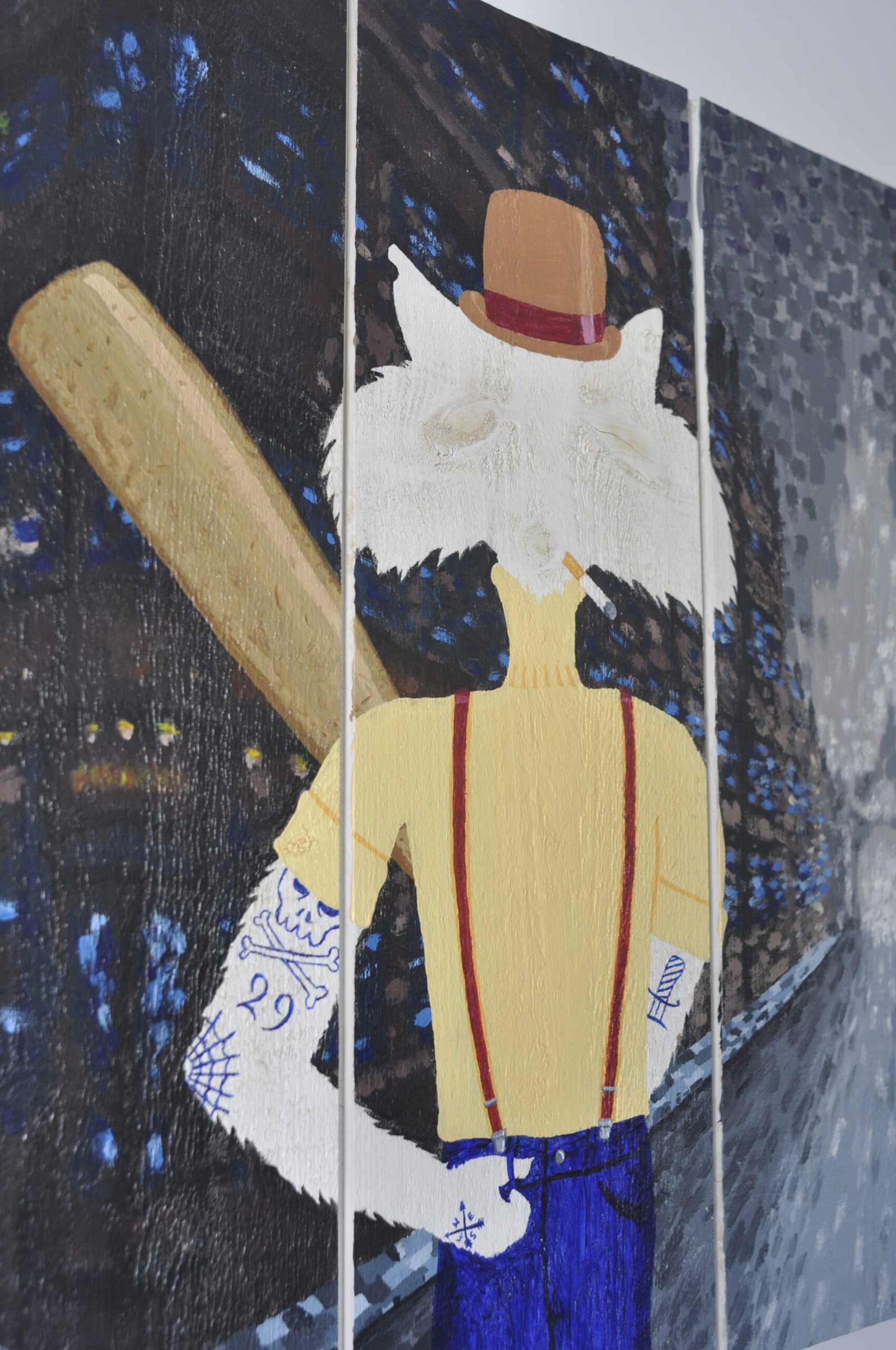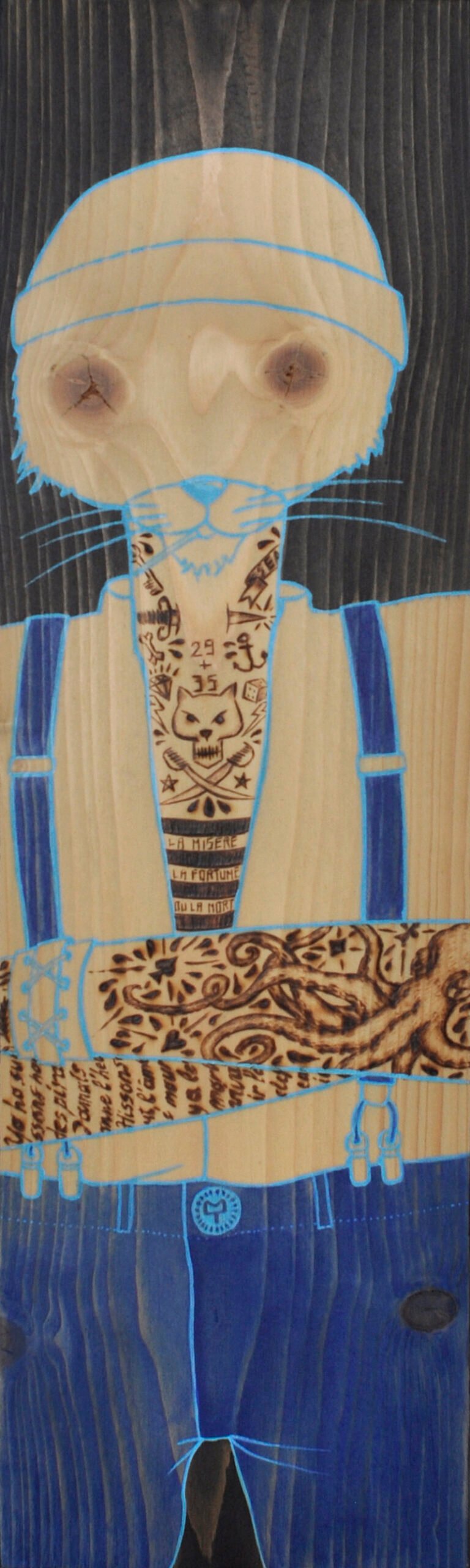 Utilisation des nœuds pour les yeux et la truffe de notre renard. Ambiance de pubs britishs et de brouillard pour ce portrait de baggareur à l'anglaise. Deux styles de peinture et un parti pris, laisser au bois sa zone d'expression sans intervention. L'effet de pelage est mis en exergue par la matière pelucheuse du bois brut.