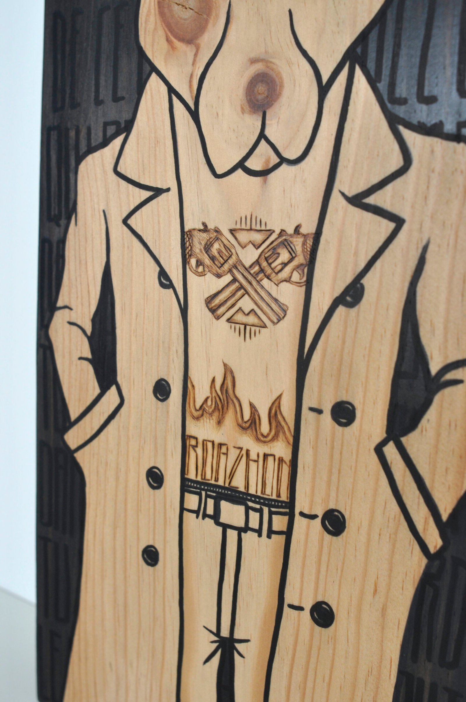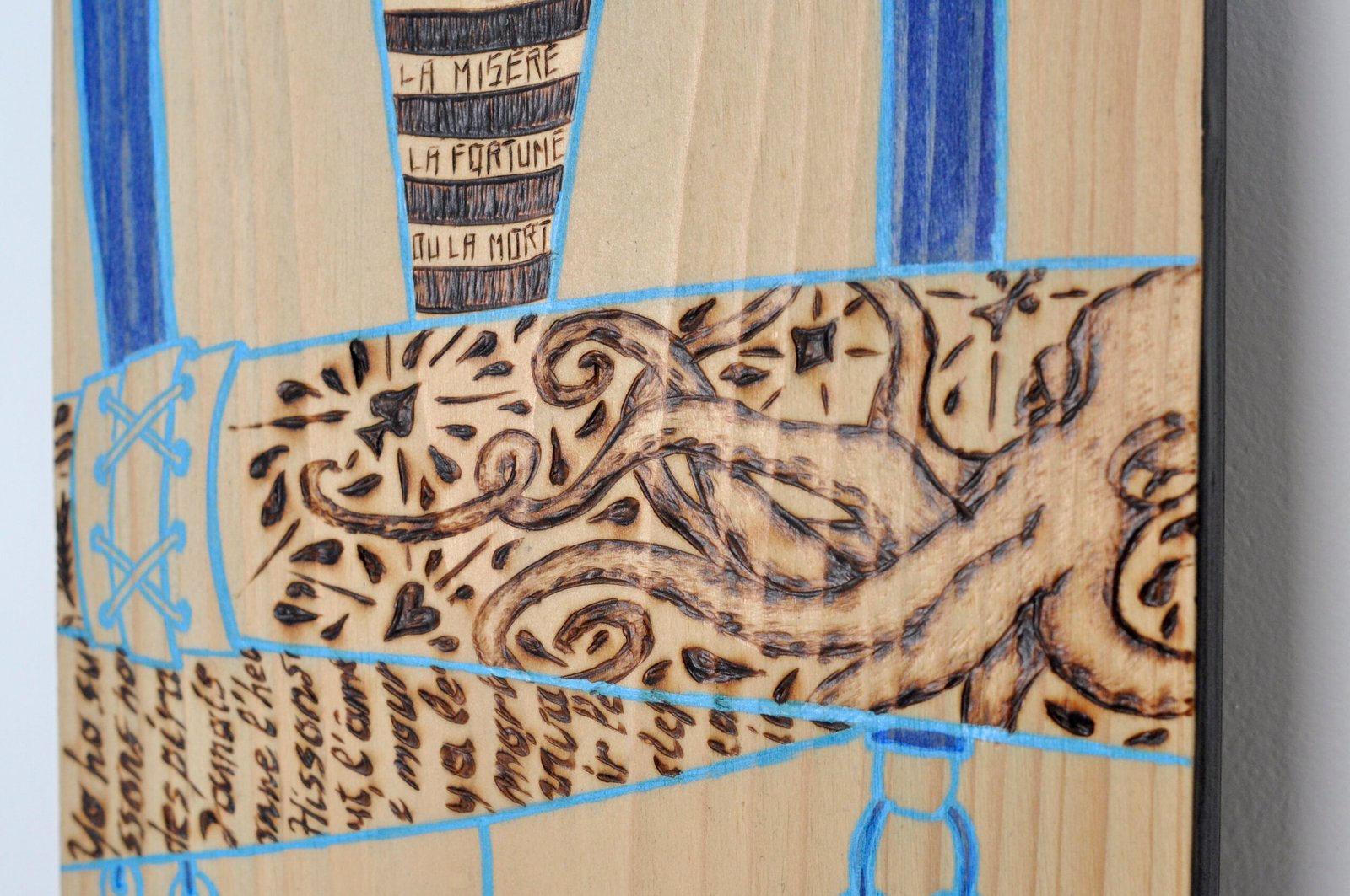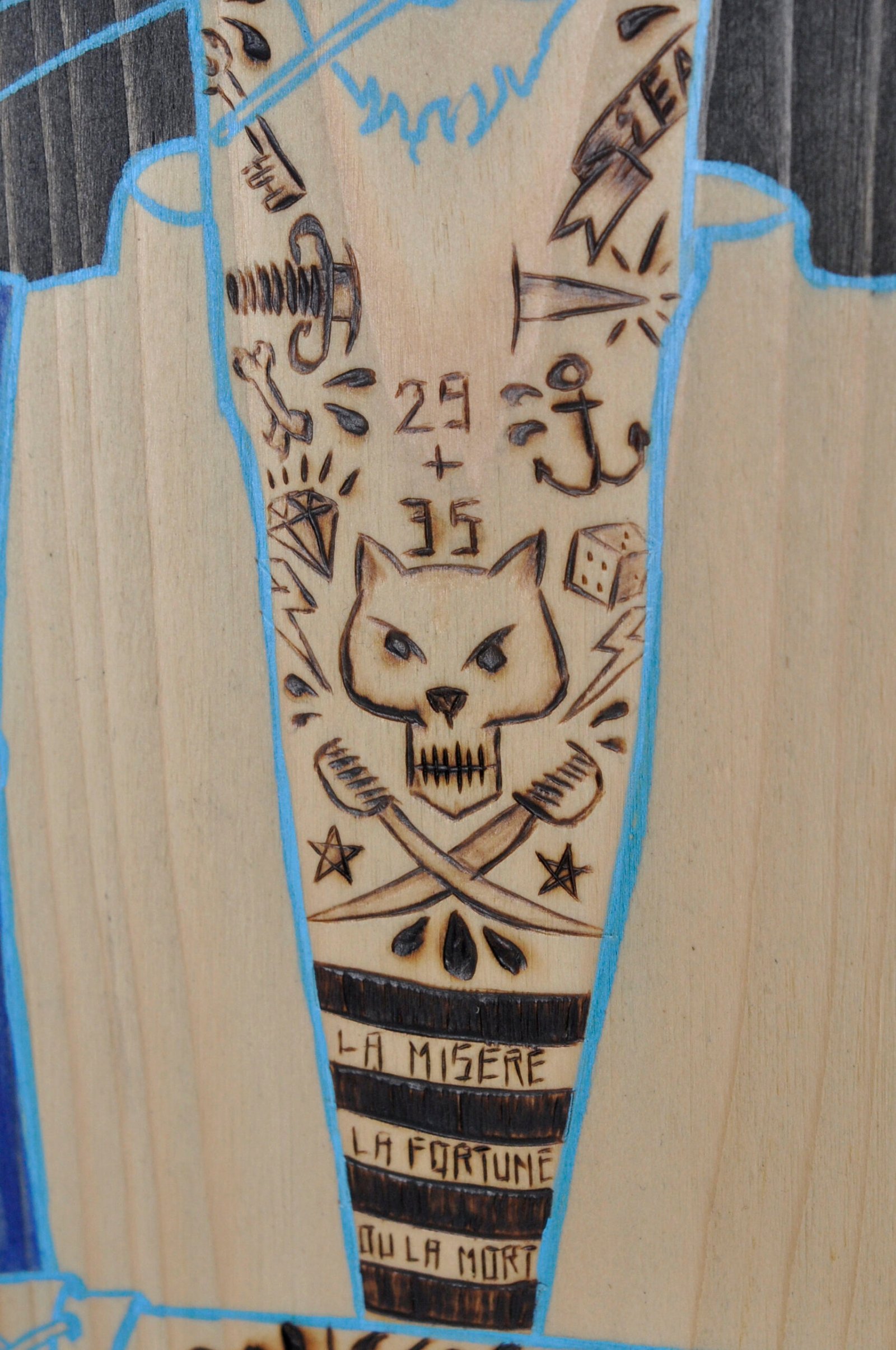 Utilisation des nœuds pour les yeux et tatouages au pyrograveur pour lui rentrer ses histoires dans la peau.