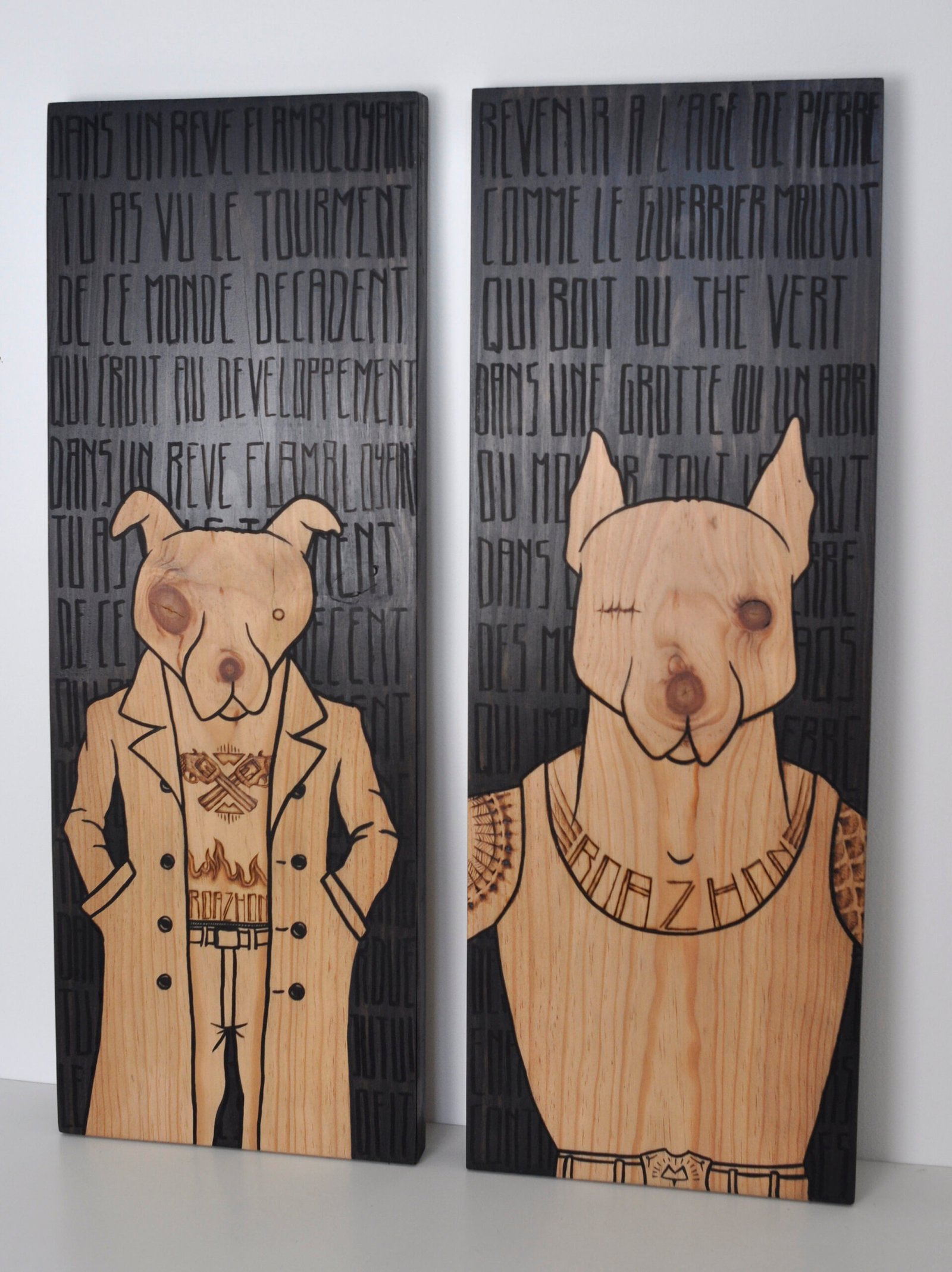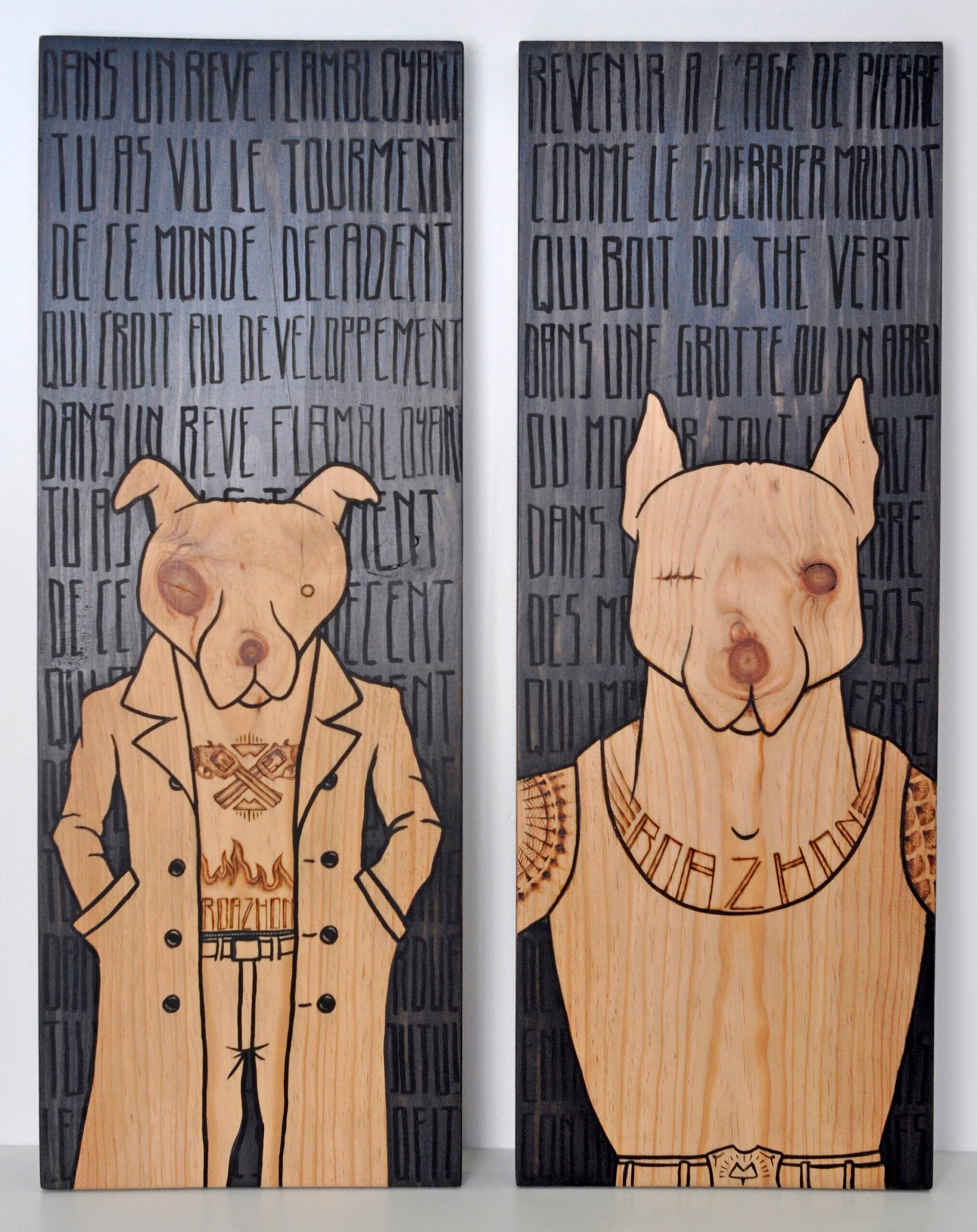 Ce ditpyque composé de ces chiens aux gueules cassés possède un arrière plan texturé par des typographies issus de musique. Ils semblent sortis d'un gang de tatoués de Rennes. Avec des noeuds quasi semblables, il est aisé de composé des persos aux gabarits bien différents.