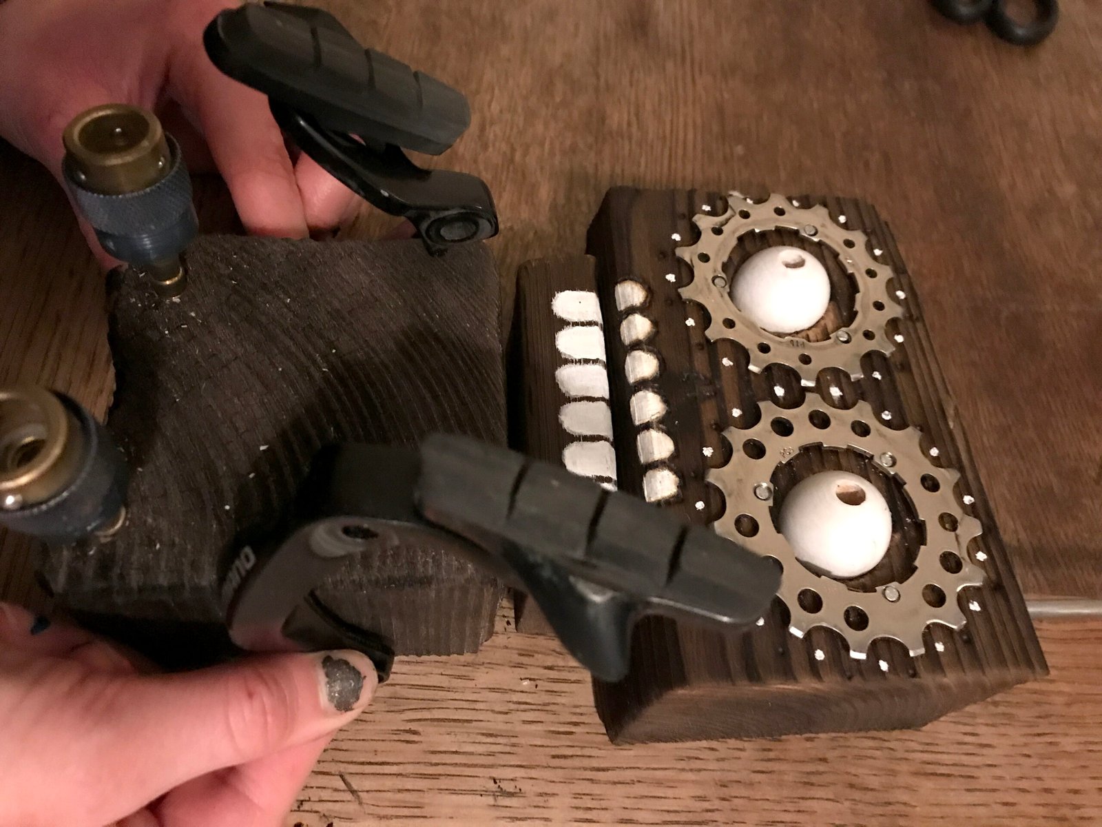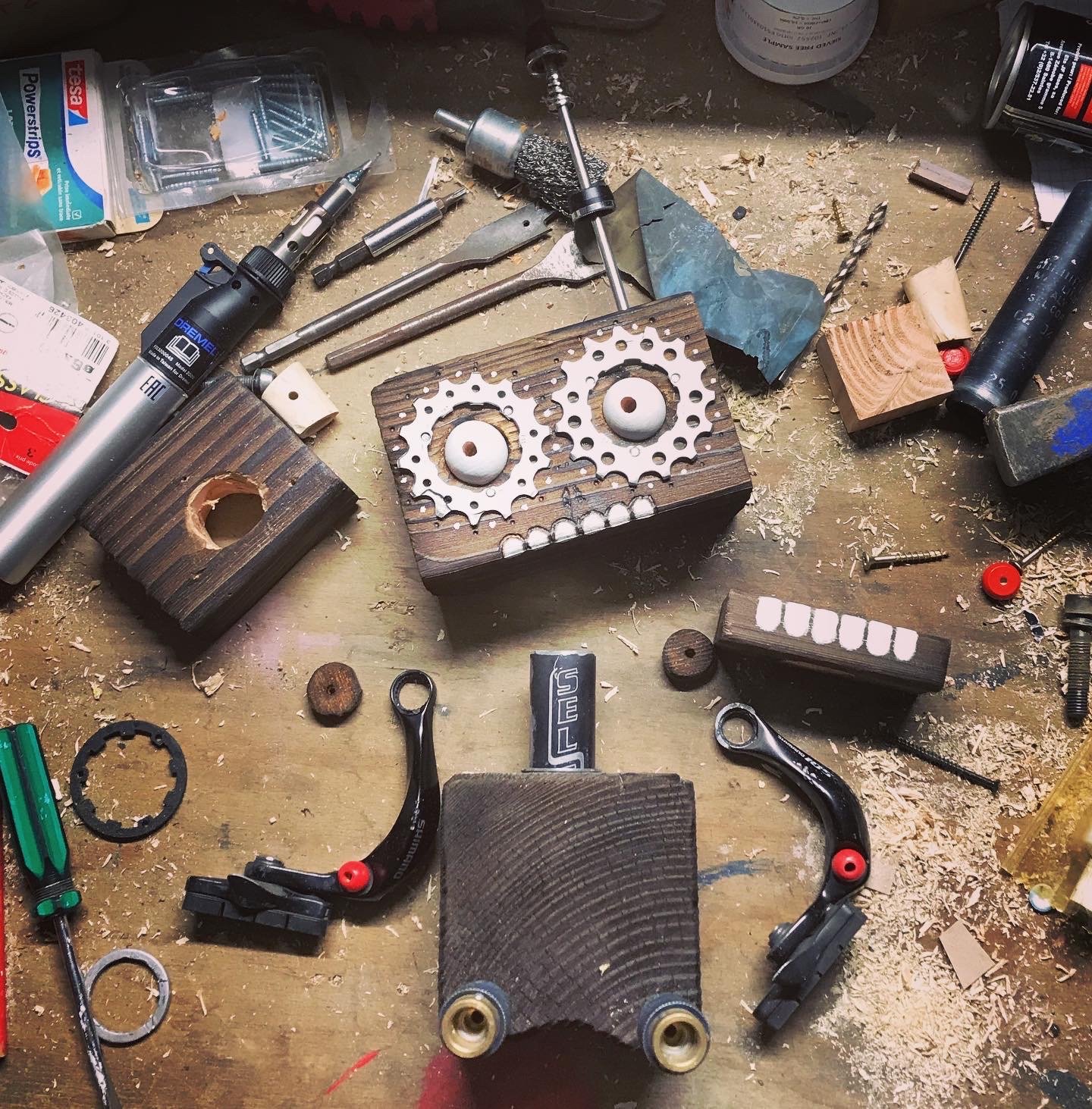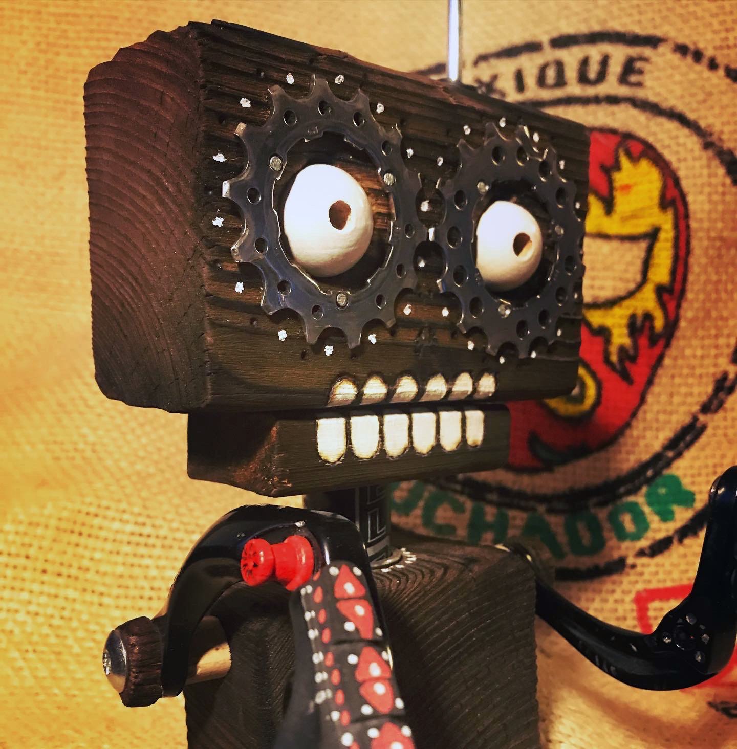 Commande sur-mesure pour un couple ayant voyagé au Mexique à vélo. Après avoir collecté des composants d'un vélo de course, assemblage dans le style Dias de la muerte. Les composants en bois sont brûlés et lui mettent en valeur son veinage.